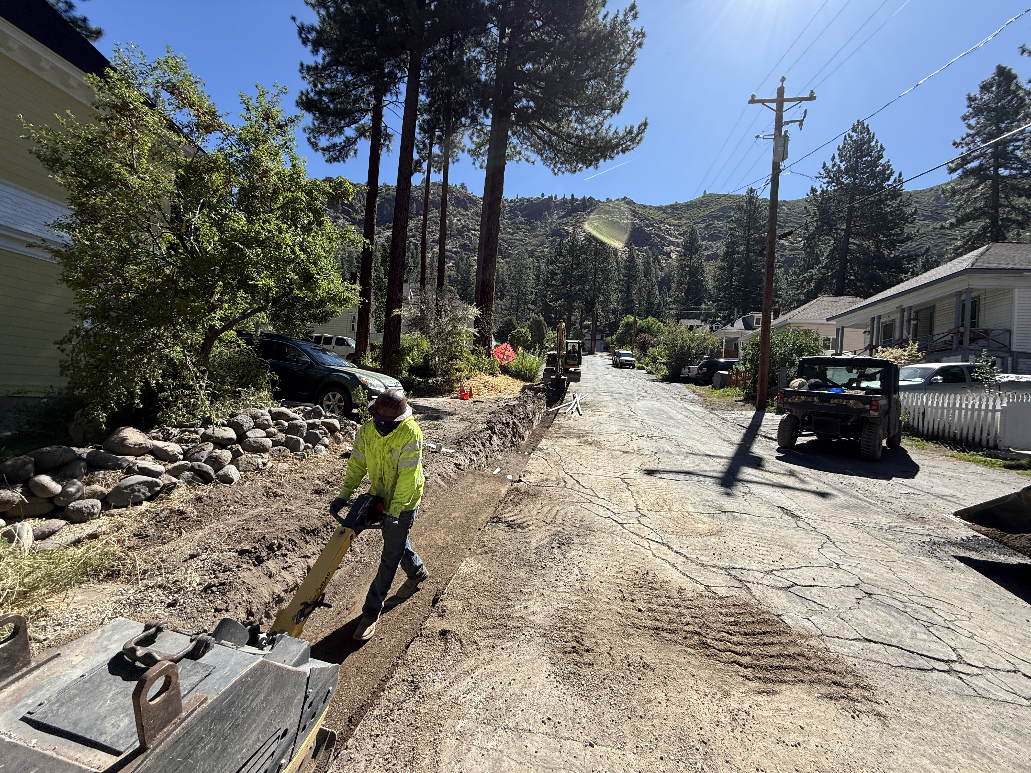 The image shows a worker wearing PPE operating a manual compactor on a trench cut along a residential street. The trench is located to the side of the road with soil piled nearby. Surrounding the work area are vehicles and residential houses, with trees in the background. The scene suggests ongoing trenching or preparation for utility installation.
