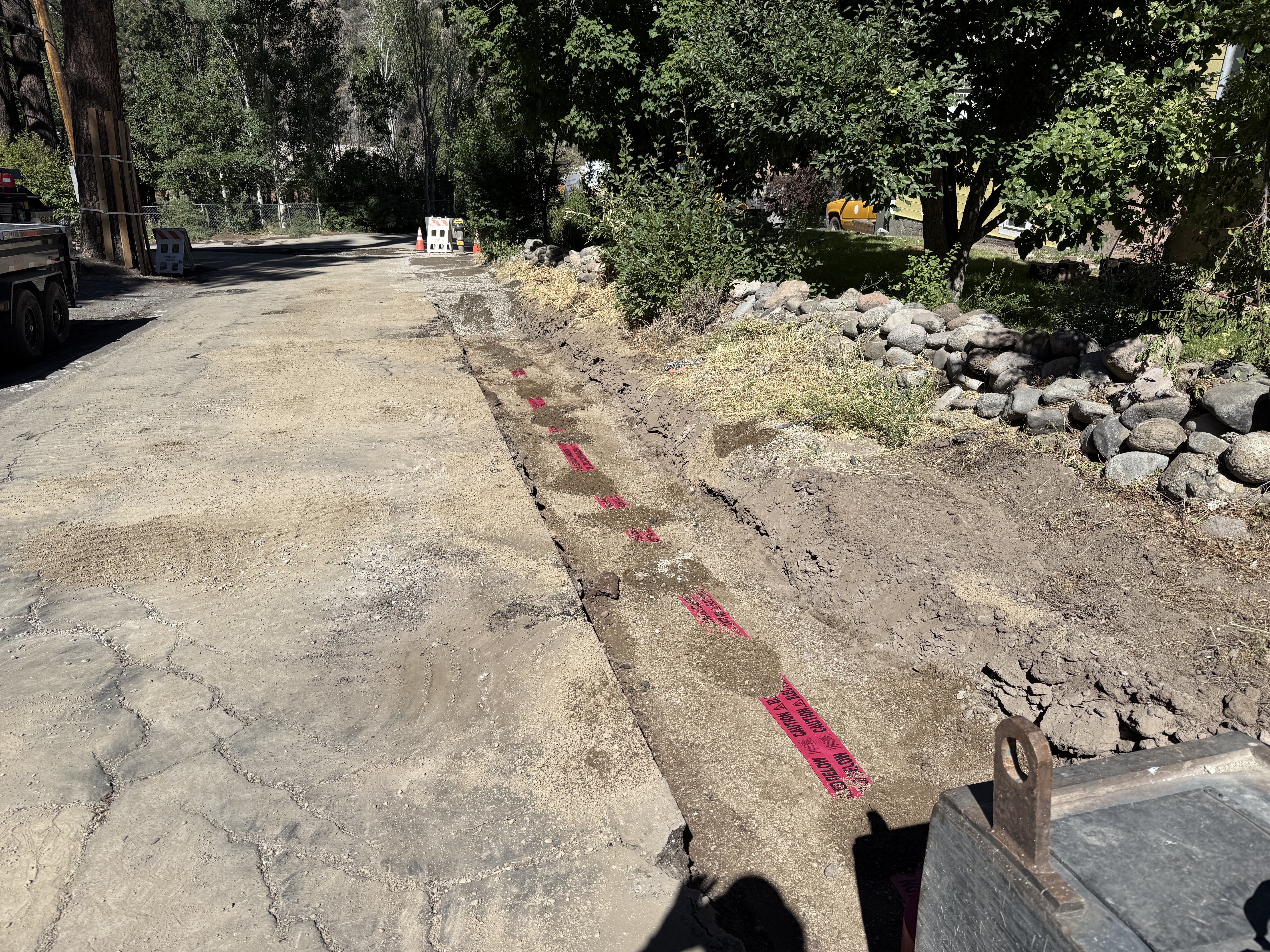 The image shows an open trench running along the side of a road with red warning tape in it, suggesting ongoing utility work. The road surface appears to be damaged or under construction, with visible cracks and loose soil. Barricades and cones are present in the background, indicating controlled access. No heavy equipment is visible, but a vehicle is partially seen on the left.