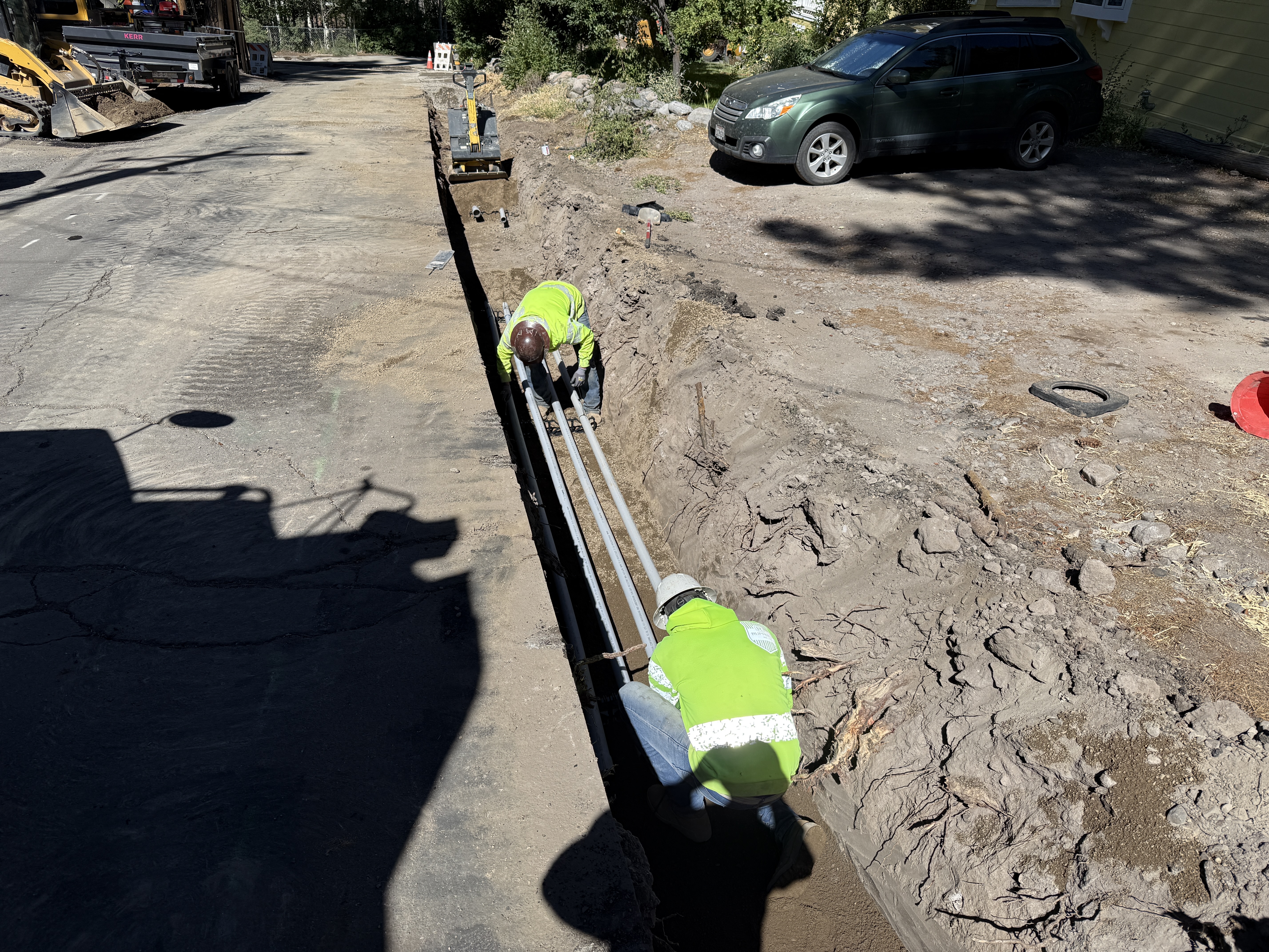 Two workers in safety gear are handling pipes in an open trench along a dirt road. A construction vehicle and a parked car are visible in the background. The trench appears to be freshly dug, with soil piled along the sides. The workers are wearing hard hats and high-visibility vests, indicating PPE compliance.