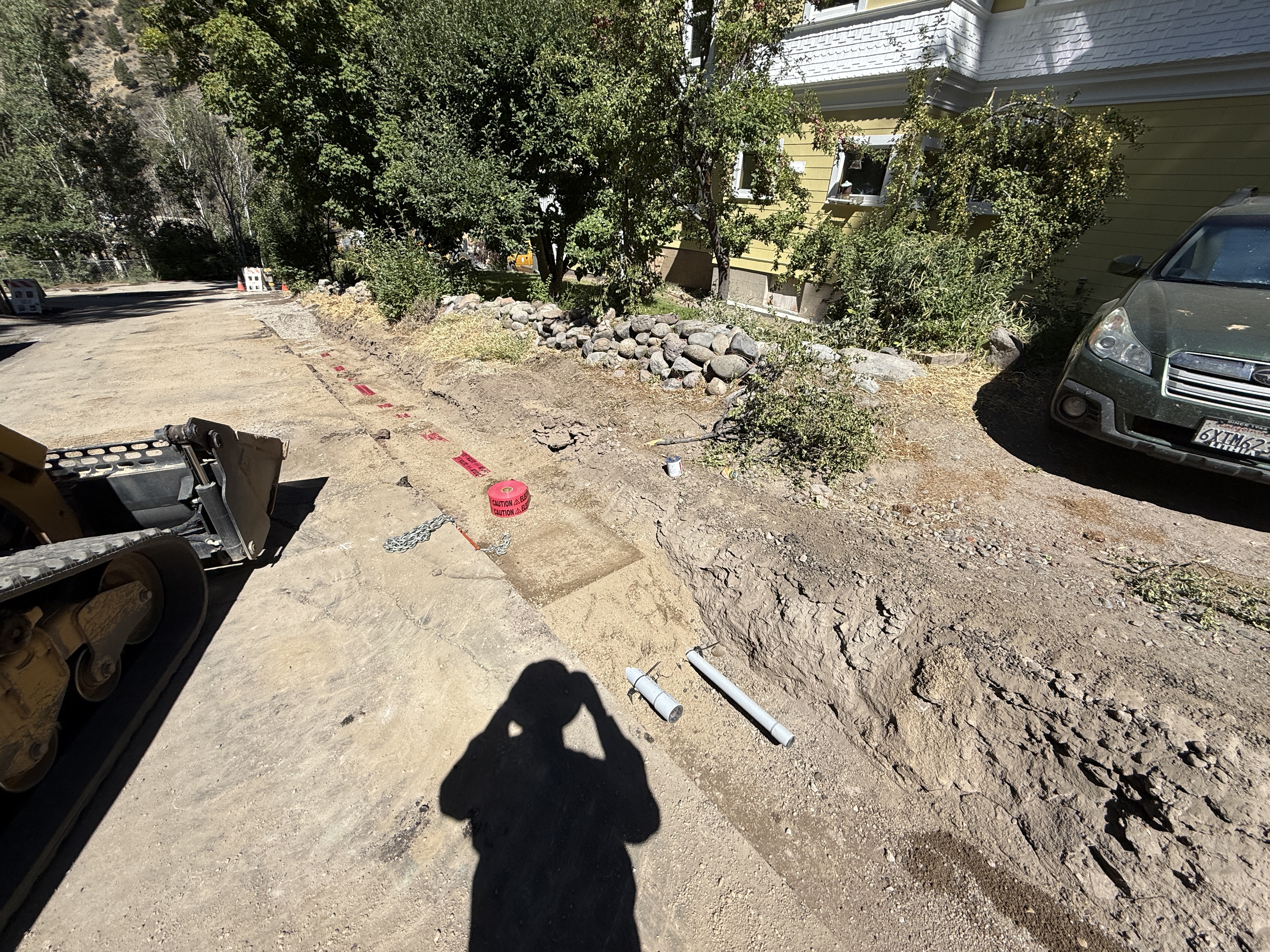 The image shows a trench along the edge of a street with PVC pipes laid nearby, indicating trenching activities. A piece of heavy machinery is partially visible on the left, possibly used for excavation or trench digging. The area is adjacent to a residential house, with vegetation visible in the surroundings. The ground is uneven with dirt and some rocks near the trench site.