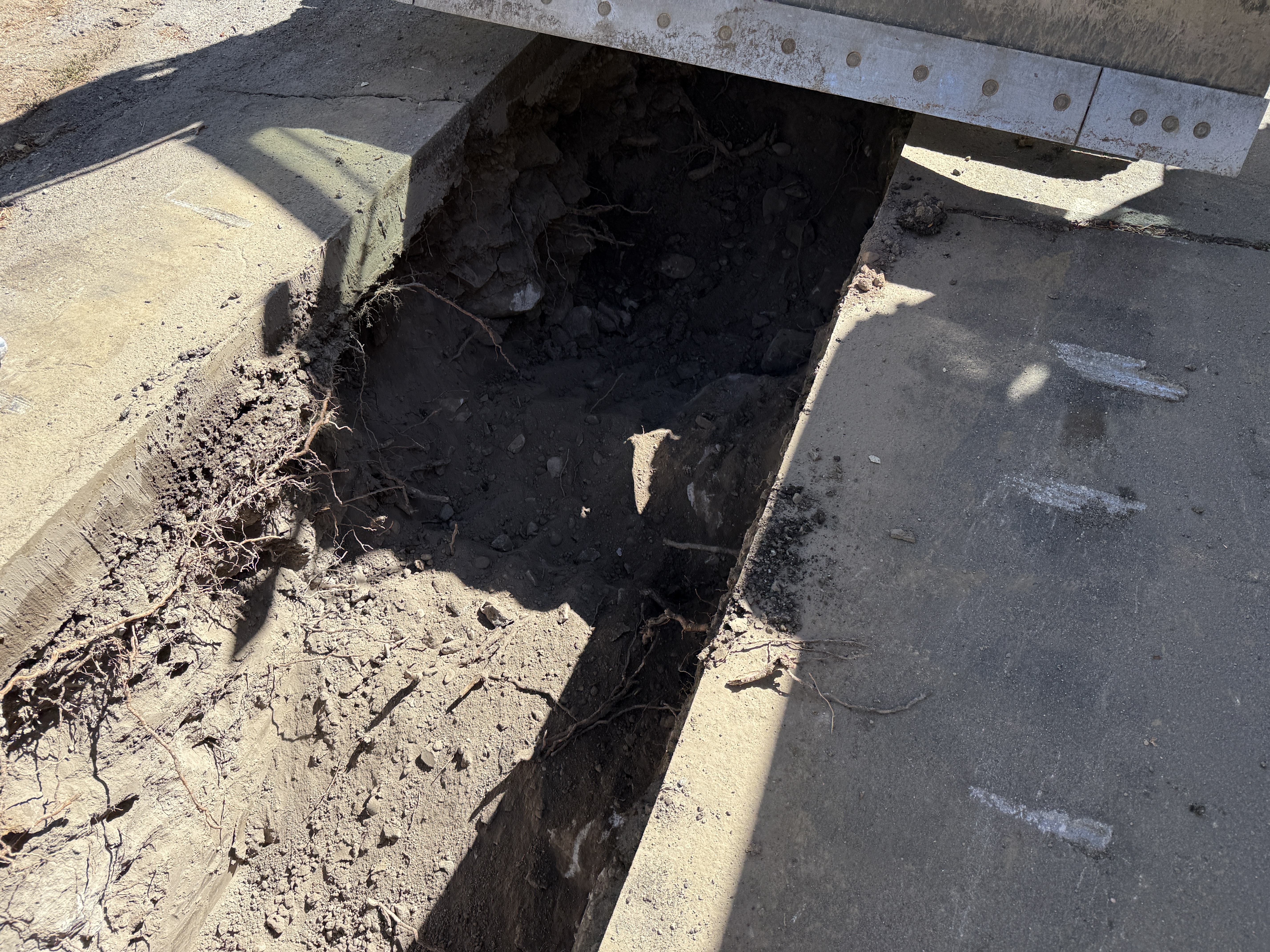 paved surface with open trench and exposed soil clear lighting with shadows visible unknown