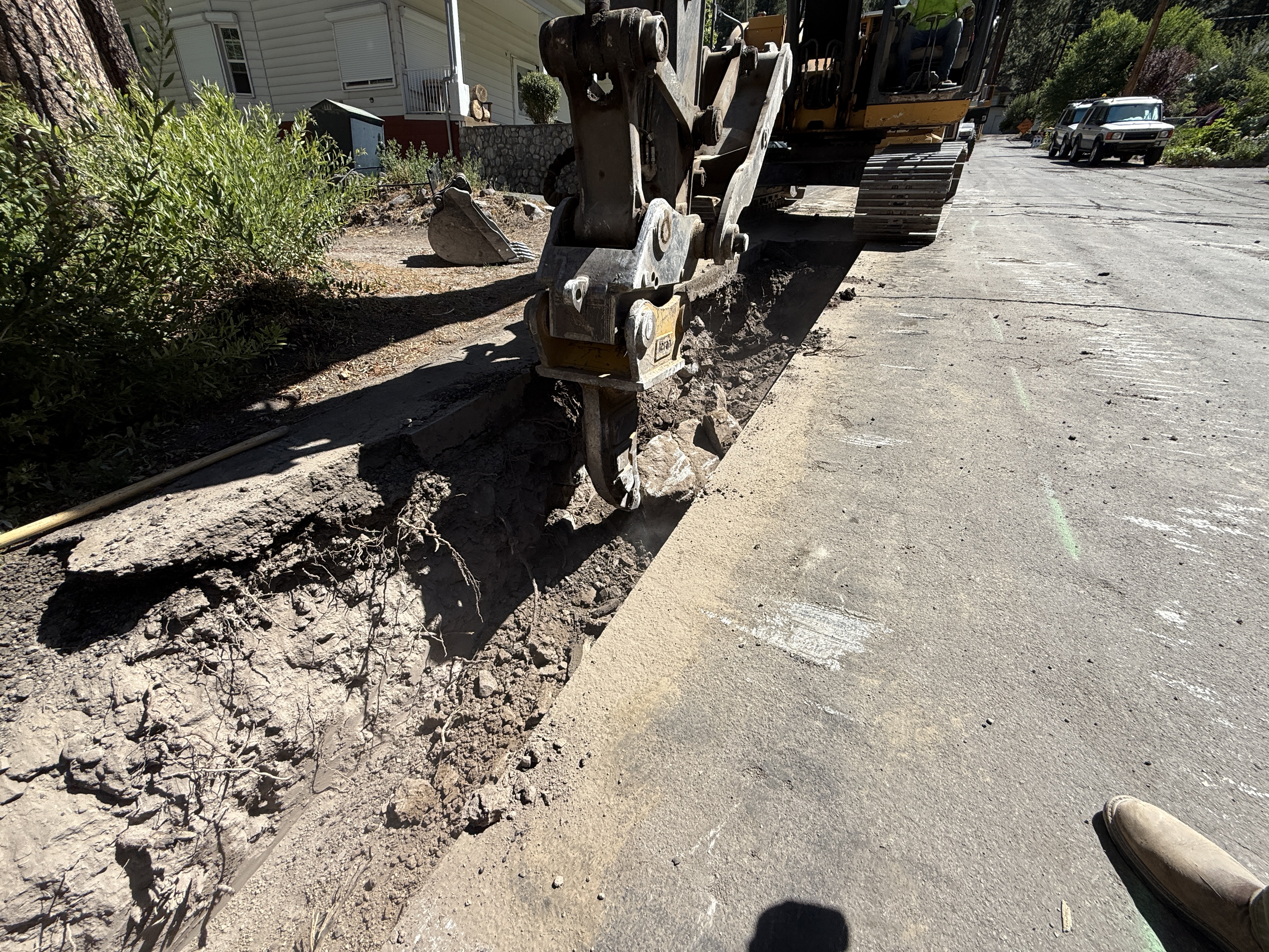 pavement edge and soil trench bright, sunny conditions roadside access with machinery staged
