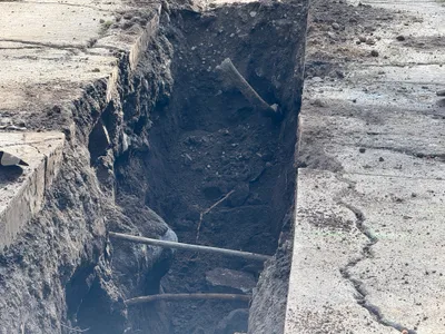 The image shows trenching work near a road, where an excavator is actively digging a section parallel to the pavement. The trench is partially excavated with soil and rock debris visible. A section of track from the excavator is also in view, indicating active machinery use. There are no visible safety barriers around the trench.