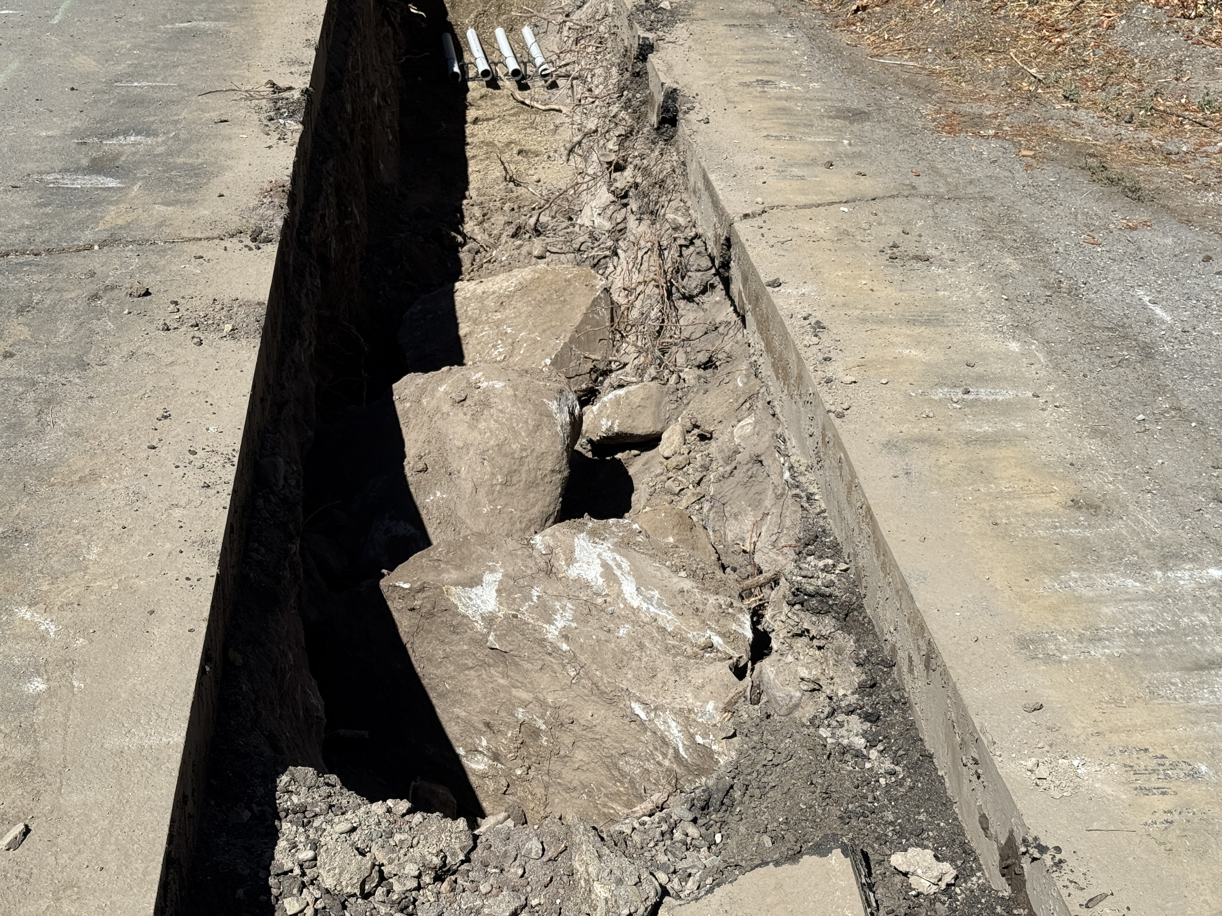 An open trench is visible along a paved surface, containing several large rocks obstructing the channel. Several small conduit pipes are positioned near one end of the trench. There are no visible signs of active work or machinery in the area.