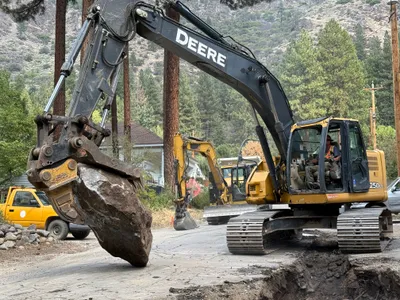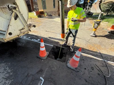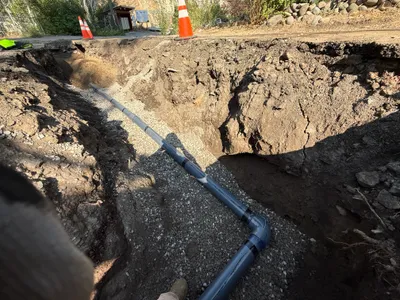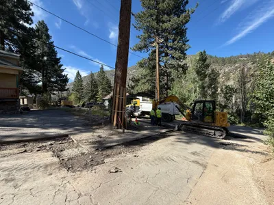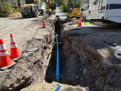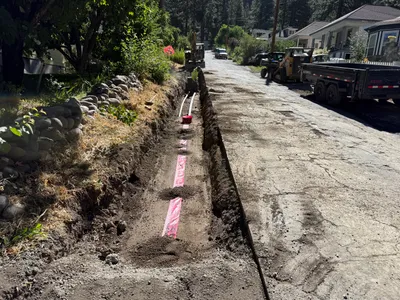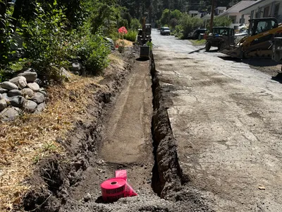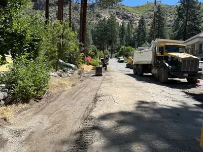 The image shows a section of a roadway undergoing excavation work, with a dirt path alongside the road indicating possible trenching activities. A large dump truck is parked on the right side of the road. In the background, additional vehicles are visible further down the road, which appears to be bordered by trees and natural landscape. The area appears to be in preparation for or in the process of grading or laying down infrastructure.