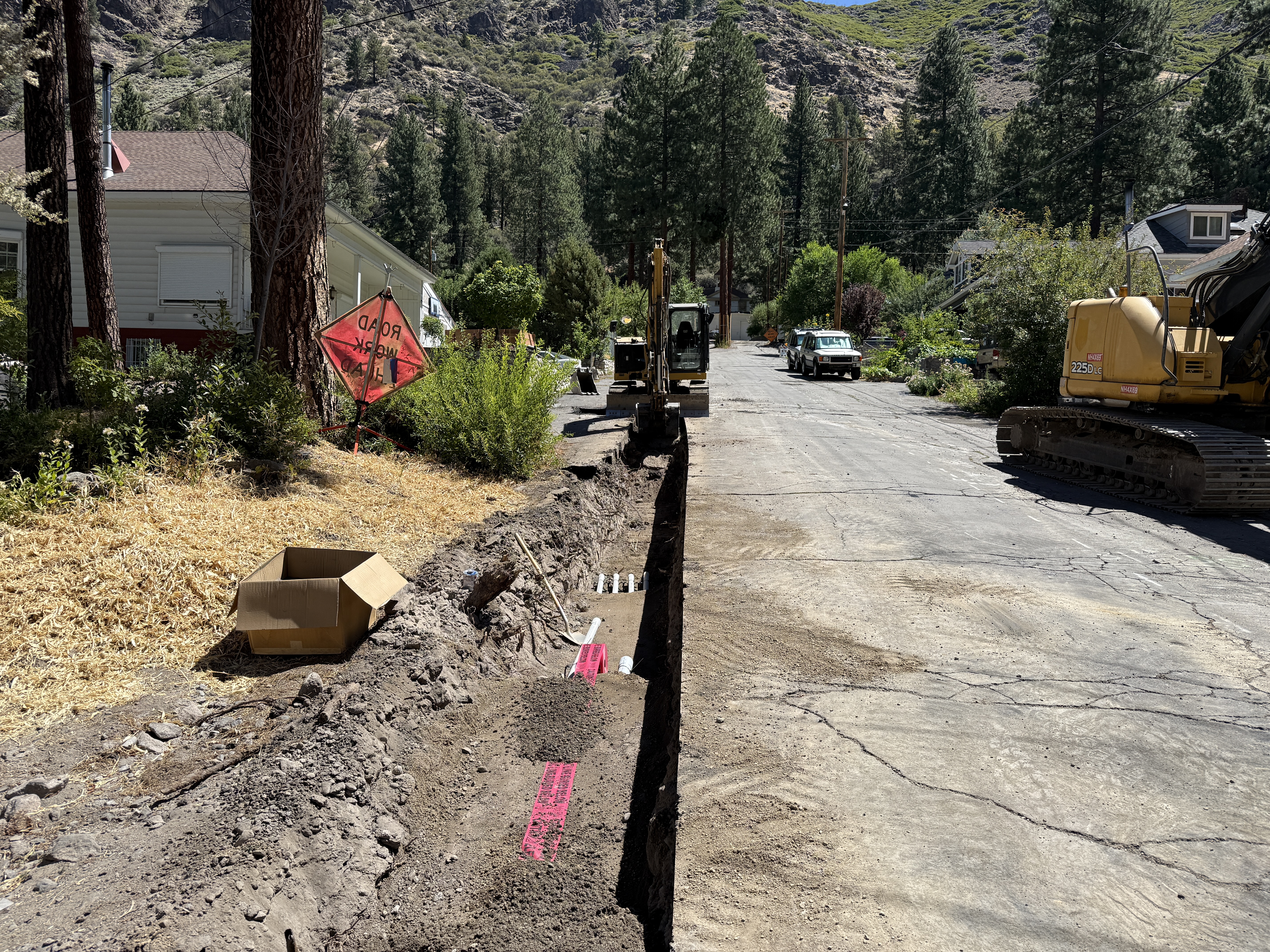 An open trench runs along the left side of a paved road, with heavy machinery including excavators positioned nearby. A cardboard box and signage indicating road work are present to the left. The trench appears to be prepared for further installation or inspection, though specific components within are not clearly visible.