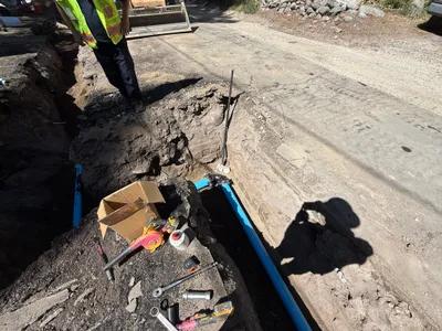 paved road with open trench clear daylight machinery staged alongside trench