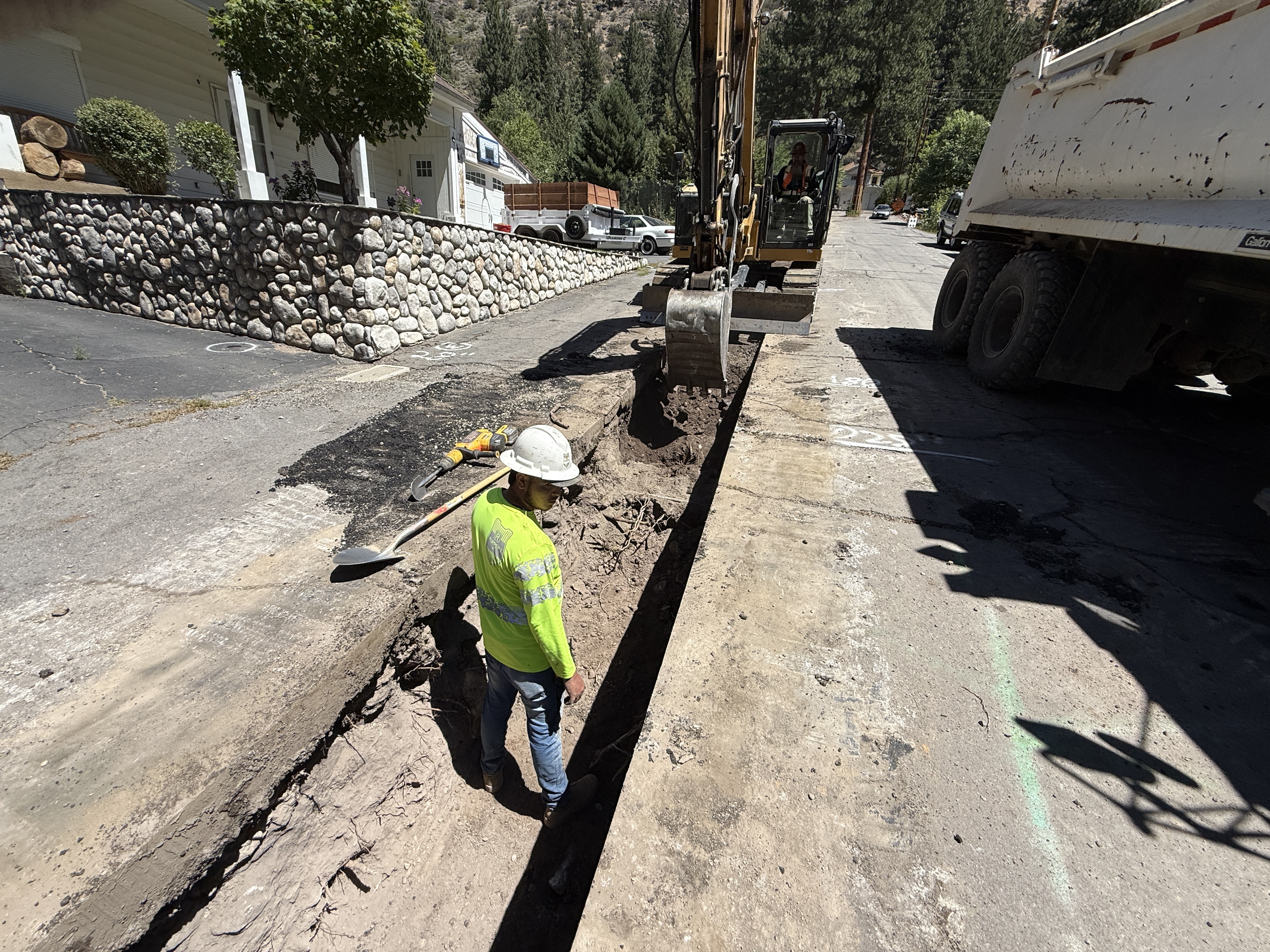 An excavator is actively digging a trench alongside a paved street, with a person standing nearby inside the trench. A dump truck is parked close to the trench where soil is being displaced. The scene includes a building and a retaining wall adjacent to the trenching operation.