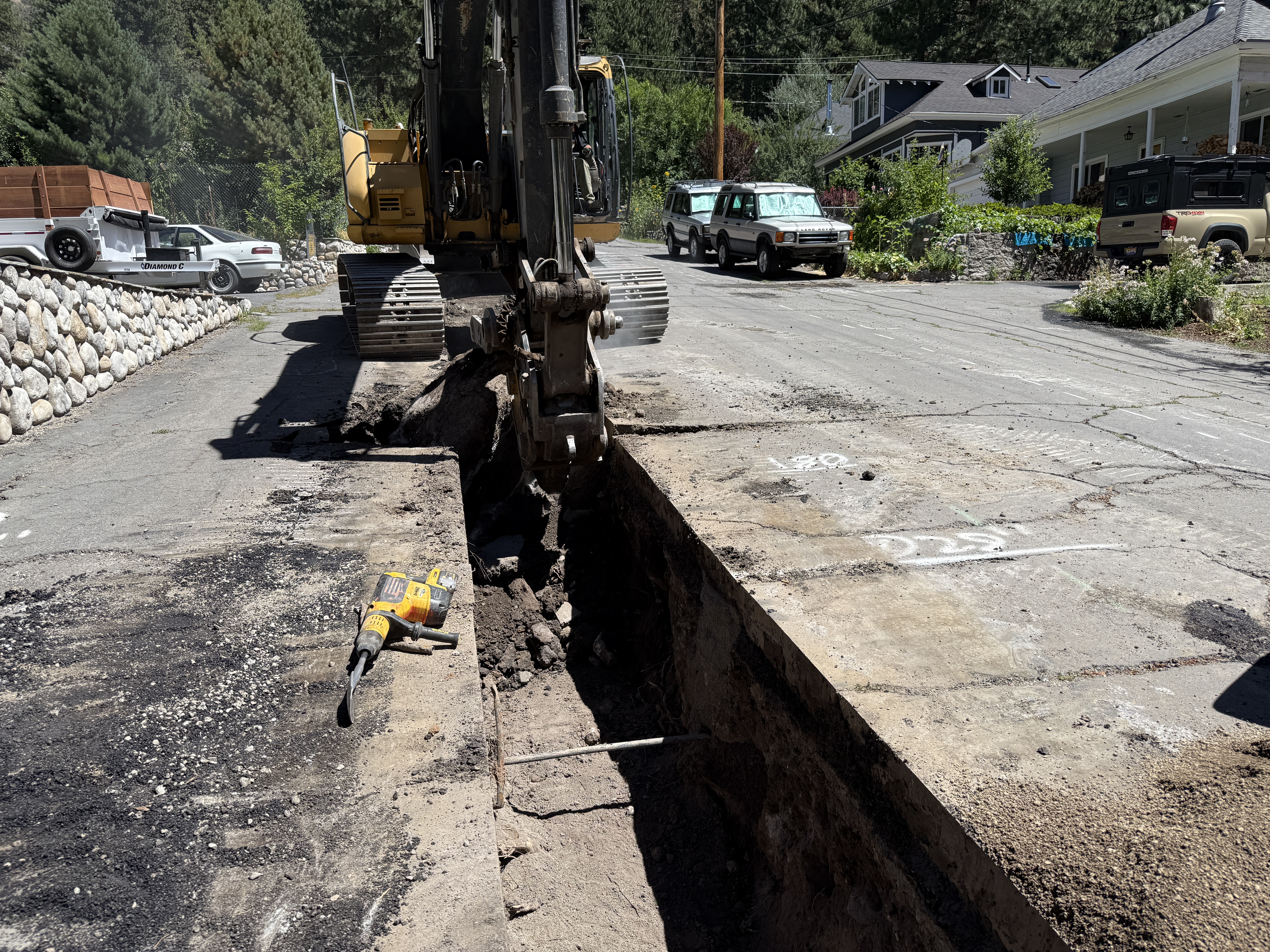 The image shows a trench along a paved road with excavation in progress. An excavator is positioned over the trench and appears to be digging. A jackhammer or pavement breaker is lying on the ground near the trench. No construction workers or safety equipment are visible in the frame.