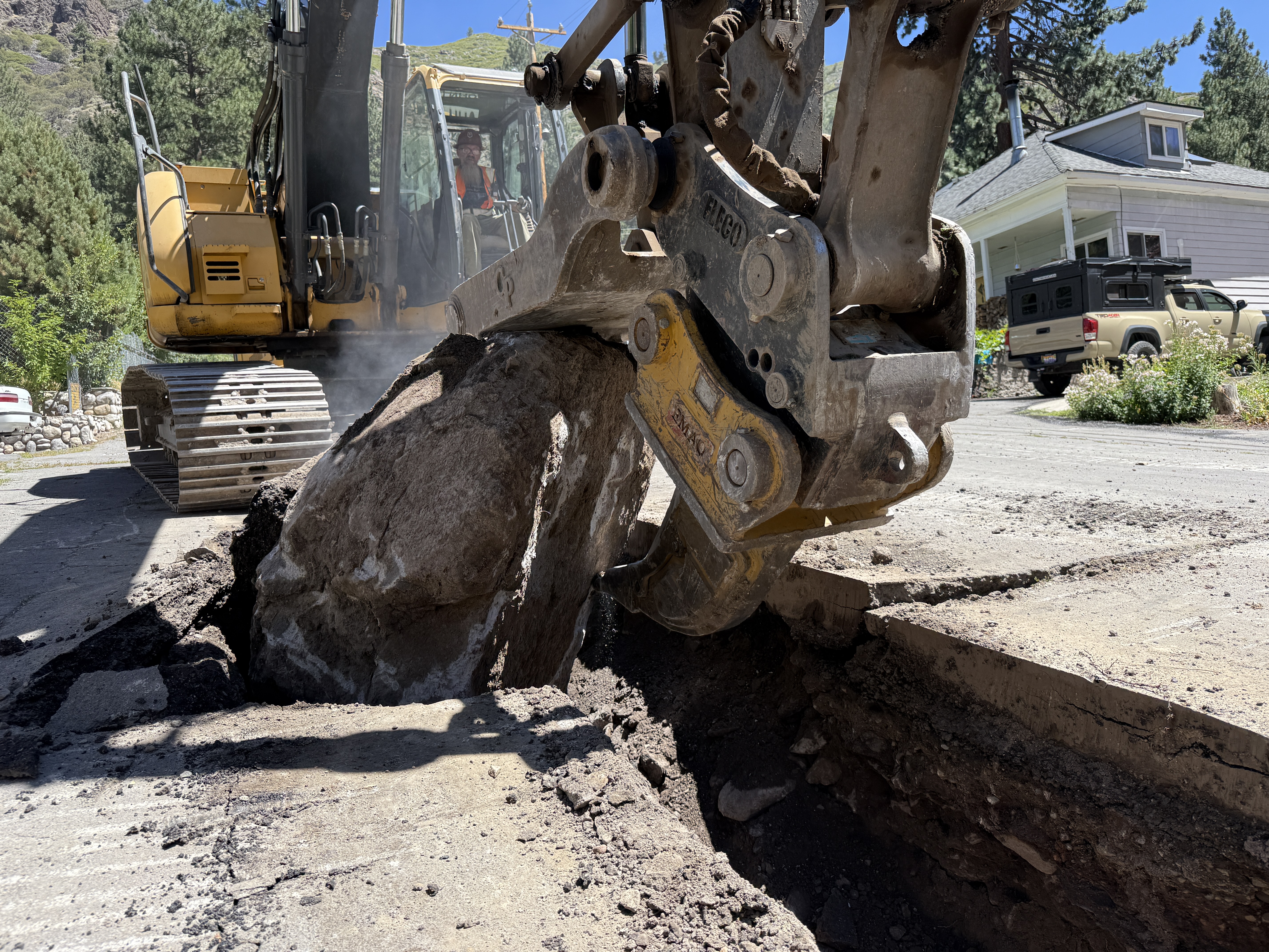 An excavator is shown lifting a large rock from a trench in a paved area. The excavator is positioned to the left with its bucket extended into the trench. The rock partially emerges from a cavity in the broken pavement. A building and a vehicle are visible in the background.