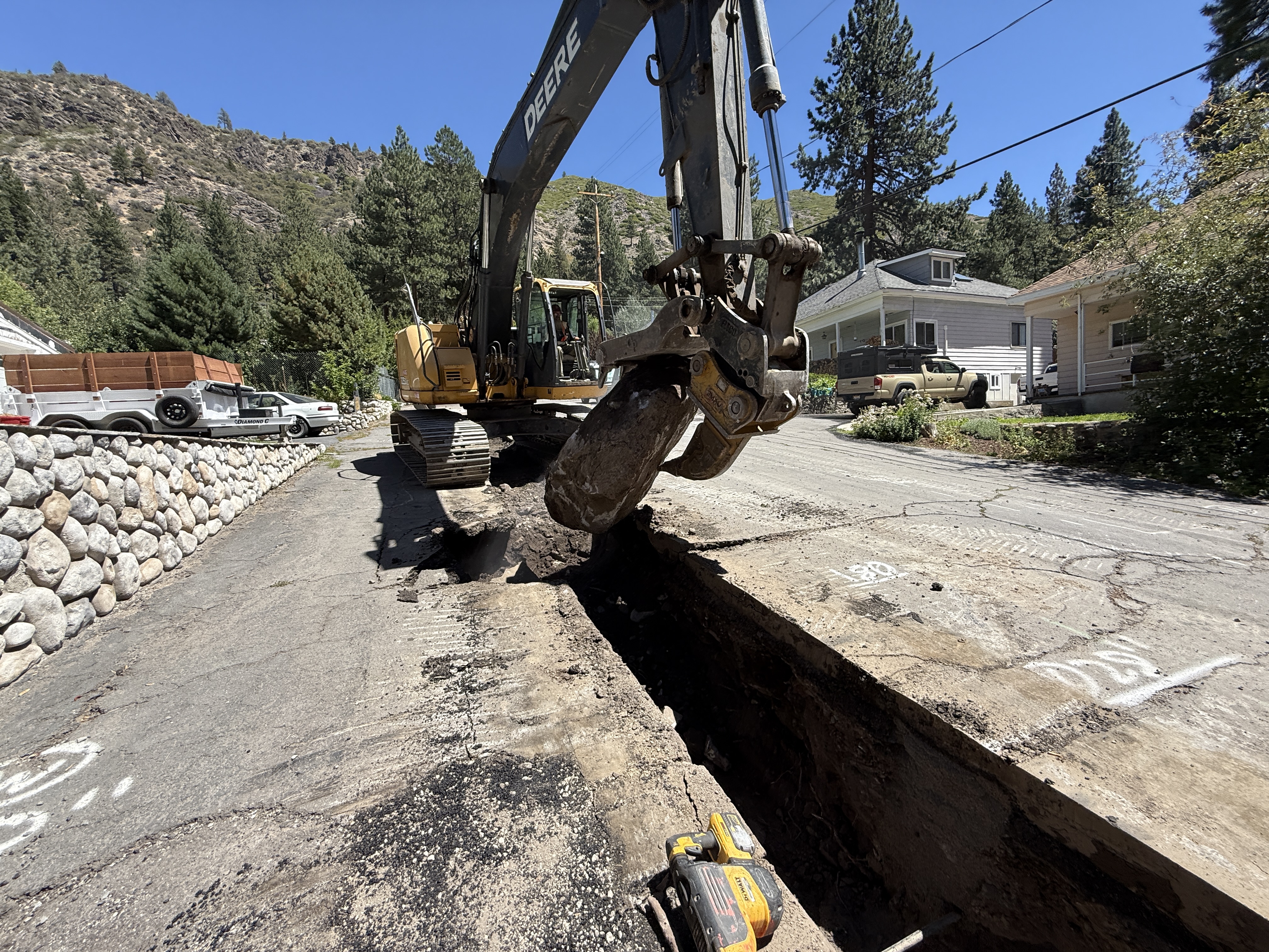An excavator is actively digging a trench along a paved road. The trench appears to run parallel to the road and is likely being prepared for some form of utility installation. There is a stone wall to the left, and residential houses are visible in the background. Some hand tools are visible near the trench.