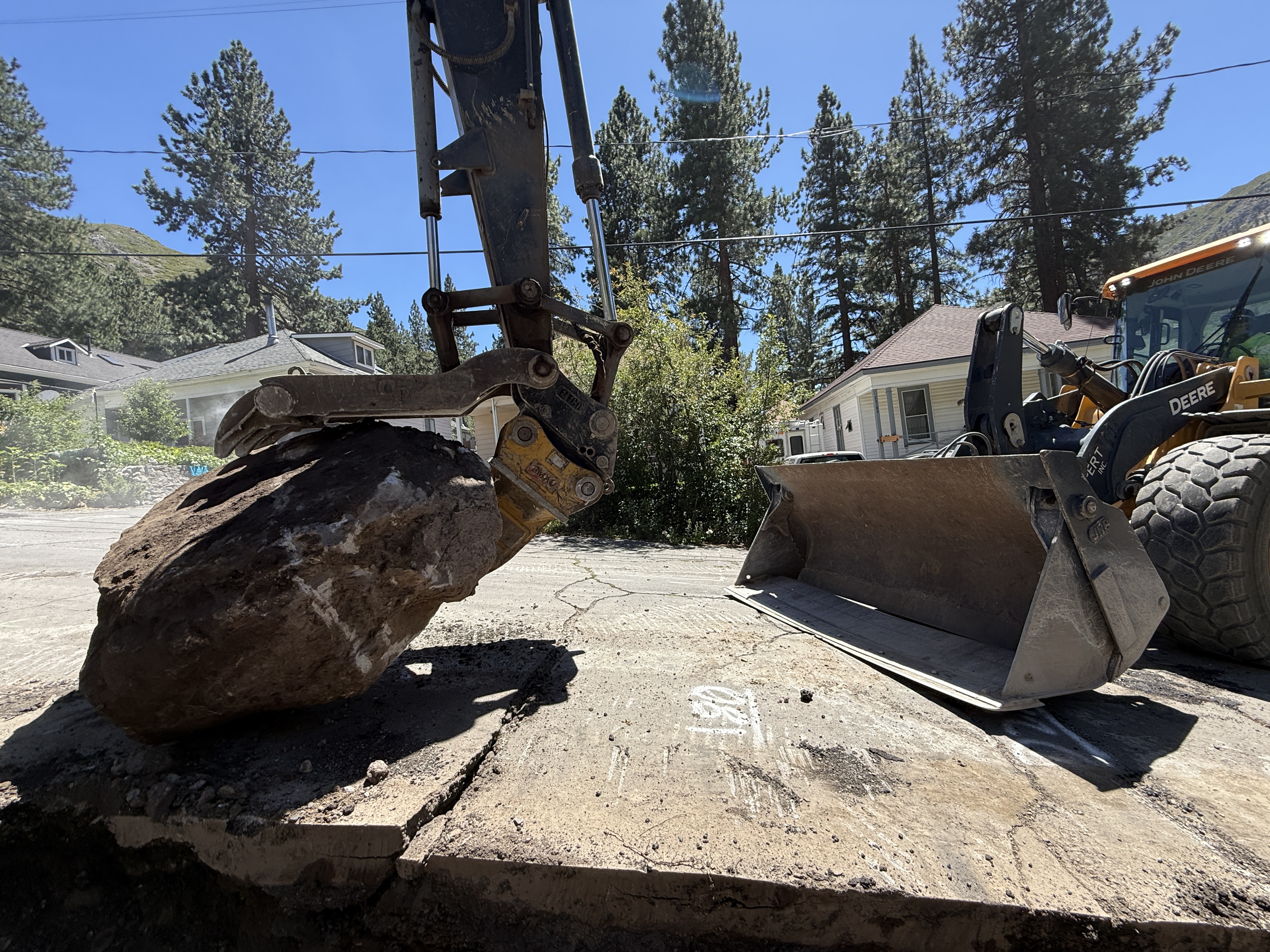 The image shows an excavator lifting a large rock, with the rock held by a claw attachment. To the right, a loader with a bucket is positioned on a paved surface. The scene is set in a residential area with surrounding trees and clear weather, indicating active excavation work is taking place.