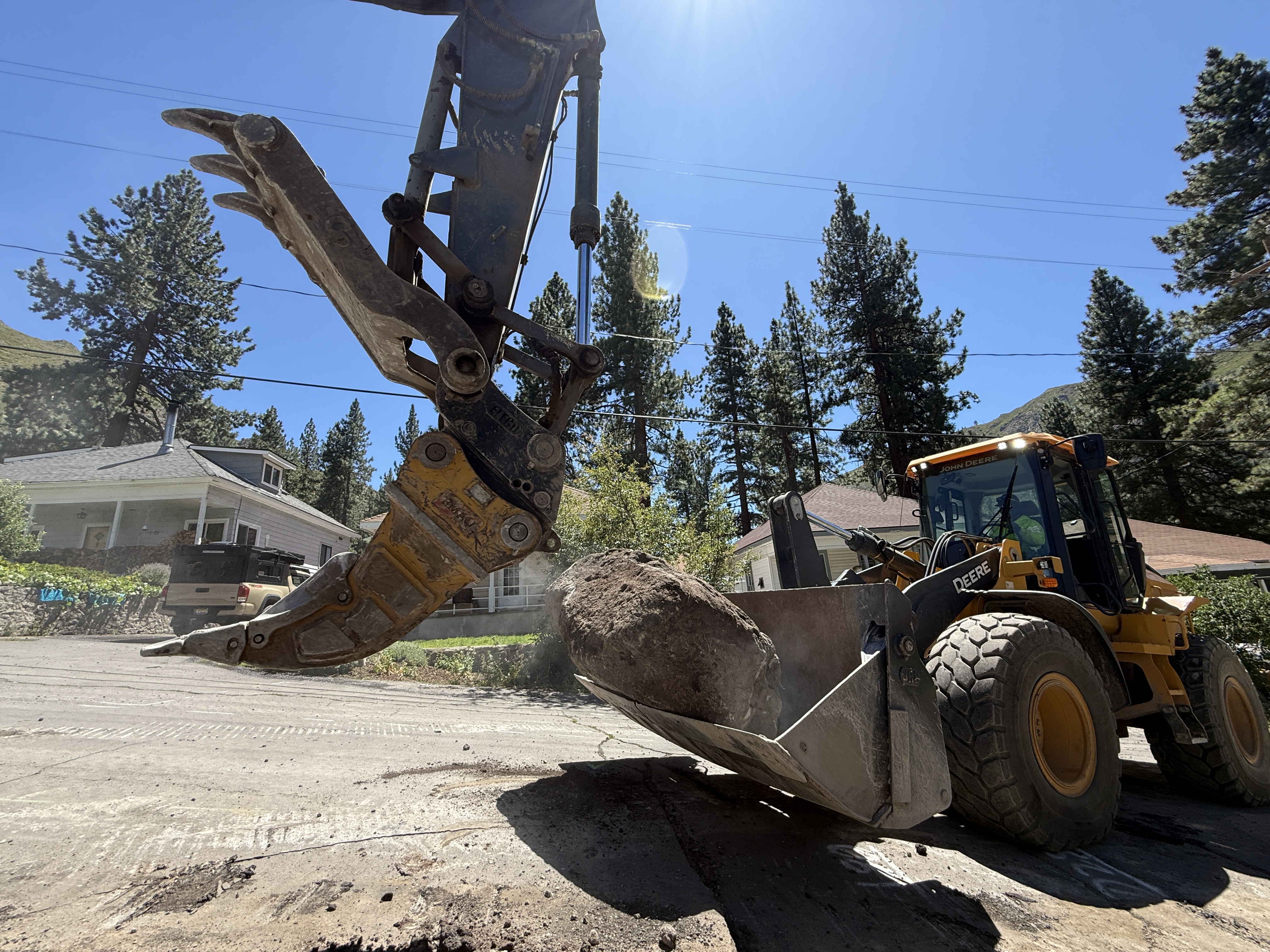 The image shows an excavator and front loader working together, likely involving the movement or excavation of soil. A large excavator arm is seen holding a claw-like attachment. A John Deere front loader is visible with its bucket carrying a load of soil or debris. Background elements include residential houses and trees in a semi-urban setting.