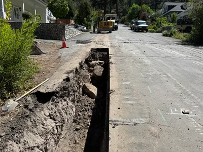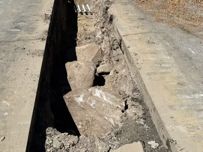 roadway and open trench sunny conditions road partially obstructed by equipment