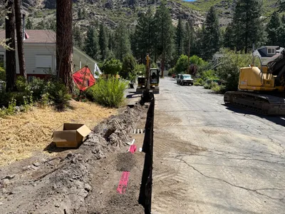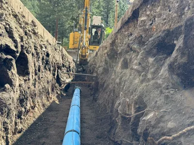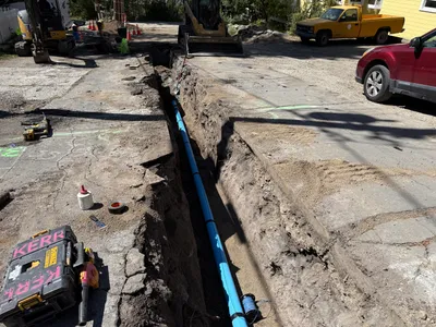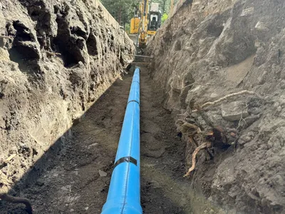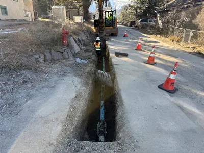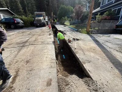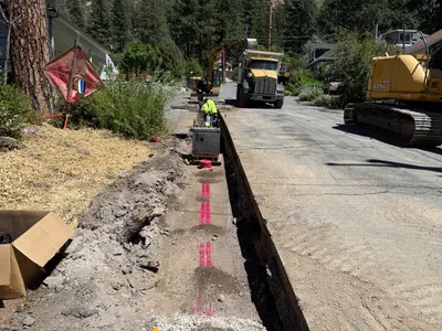 The image shows an open trench along a roadway with a worker present inside the trench. A large excavator and a dump truck are positioned on the road with some construction materials scattered at the trench edge. A pink caution tape is laid along the trench. Nearby, there is a utility box, and the area is surrounded by trees.