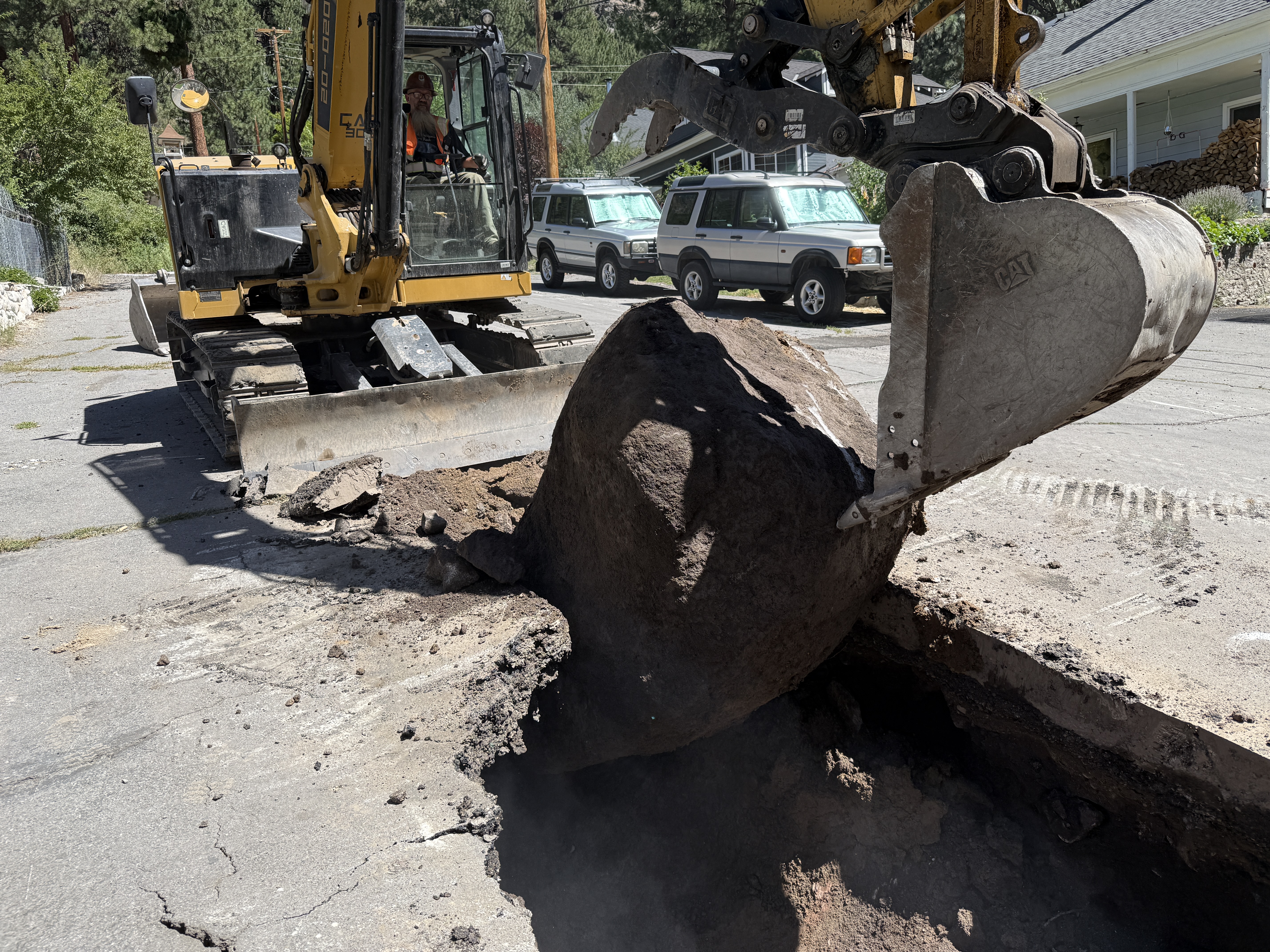The image shows an excavator lifting a large rock from a trench in a paved area. A worker is operating the excavator, and a loader is positioned nearby. The trench is in the center of a road or lot with cracked pavement around it. This is likely part of the duct bank finished water tank project.