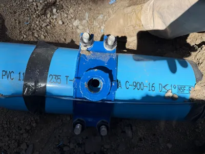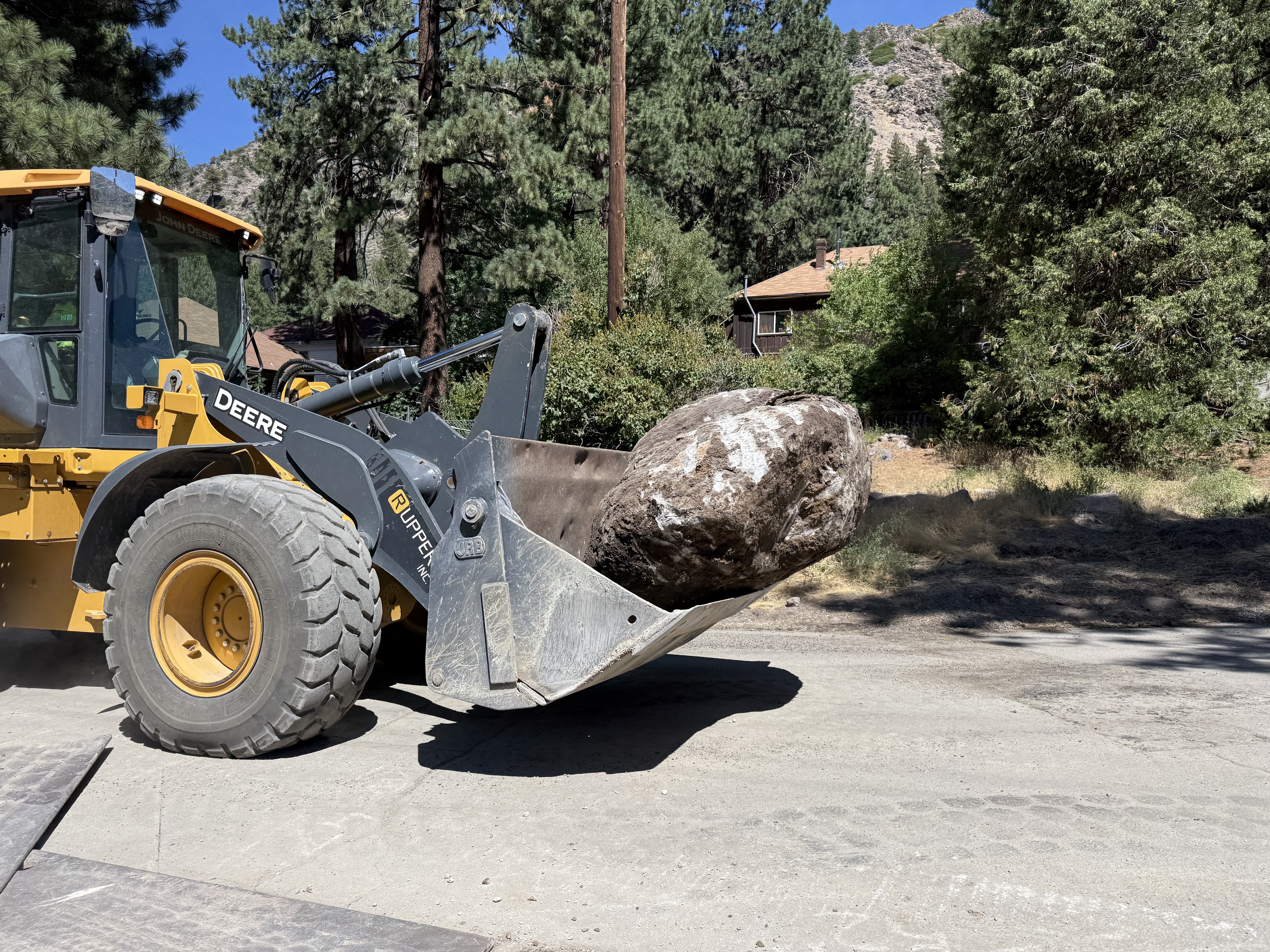 The image shows a yellow front-end loader with the bucket raised, carrying a large boulder. The machine is on a paved surface surrounded by trees, indicating a forested area. No active trenching or visible trench structures are present in this image. The lighting suggests it is a clear day, but no construction workers or PPE are visible.