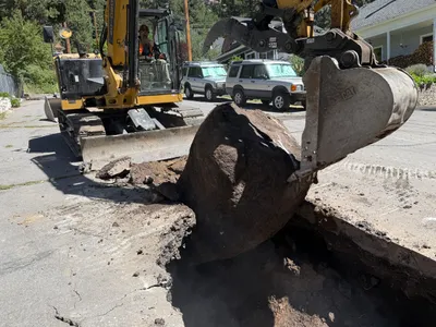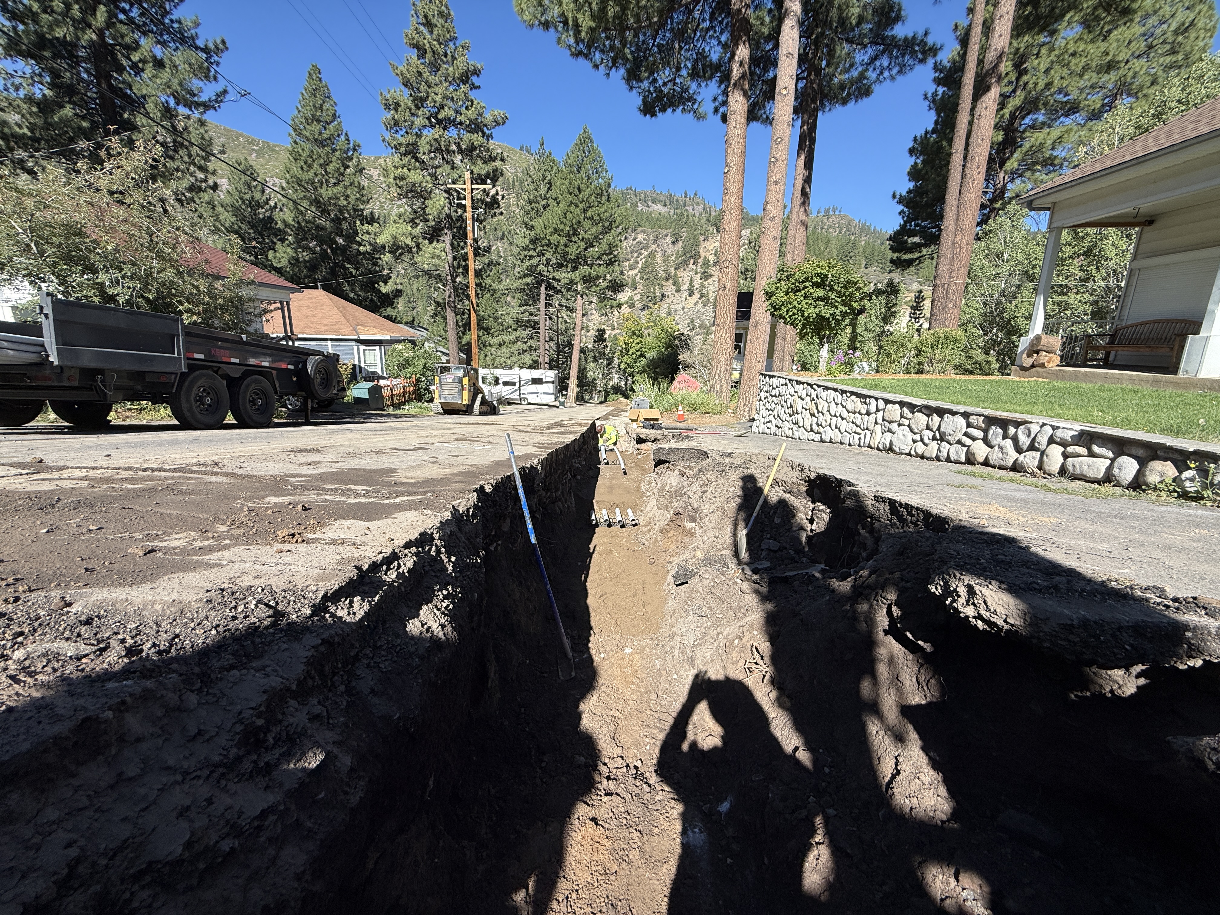 An open trench runs through a residential area with a worker in the trench. The trench has exposed soil and is bordered by asphalt on one side. A truck and heavy equipment are visible in the background next to houses and trees. The worker is wearing safety gear including a hard hat and hi-vis vest.