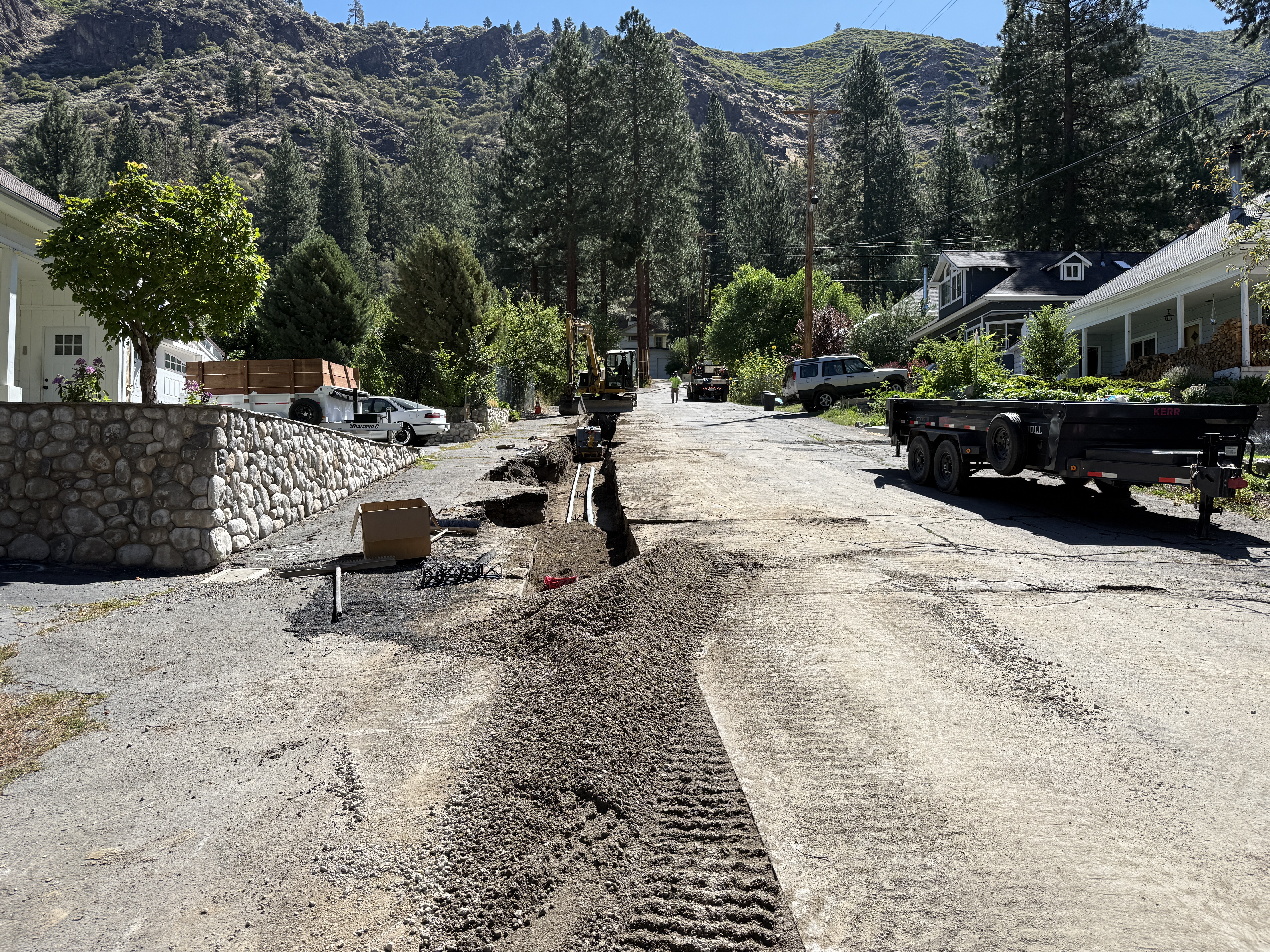 The image shows a residential street with trenching work being carried out on the side of the pavement. An excavator is visible alongside the trench, which runs parallel to the street's direction. There are vehicles parked nearby, including a trailer and a truck. The trench indicates that work is focused around underground installations or repairs, with visible soil and construction materials next to the trench.
