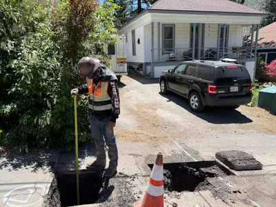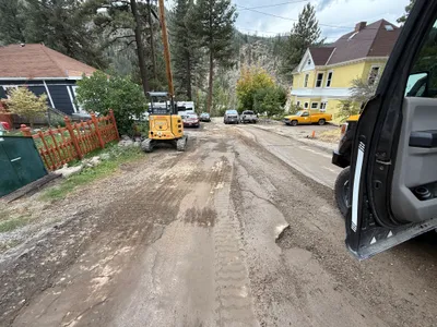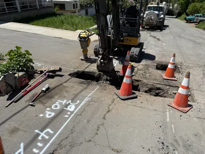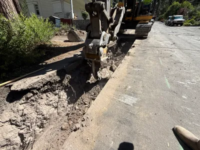 paved road with open trench sunny and clear limited access due to residential setting