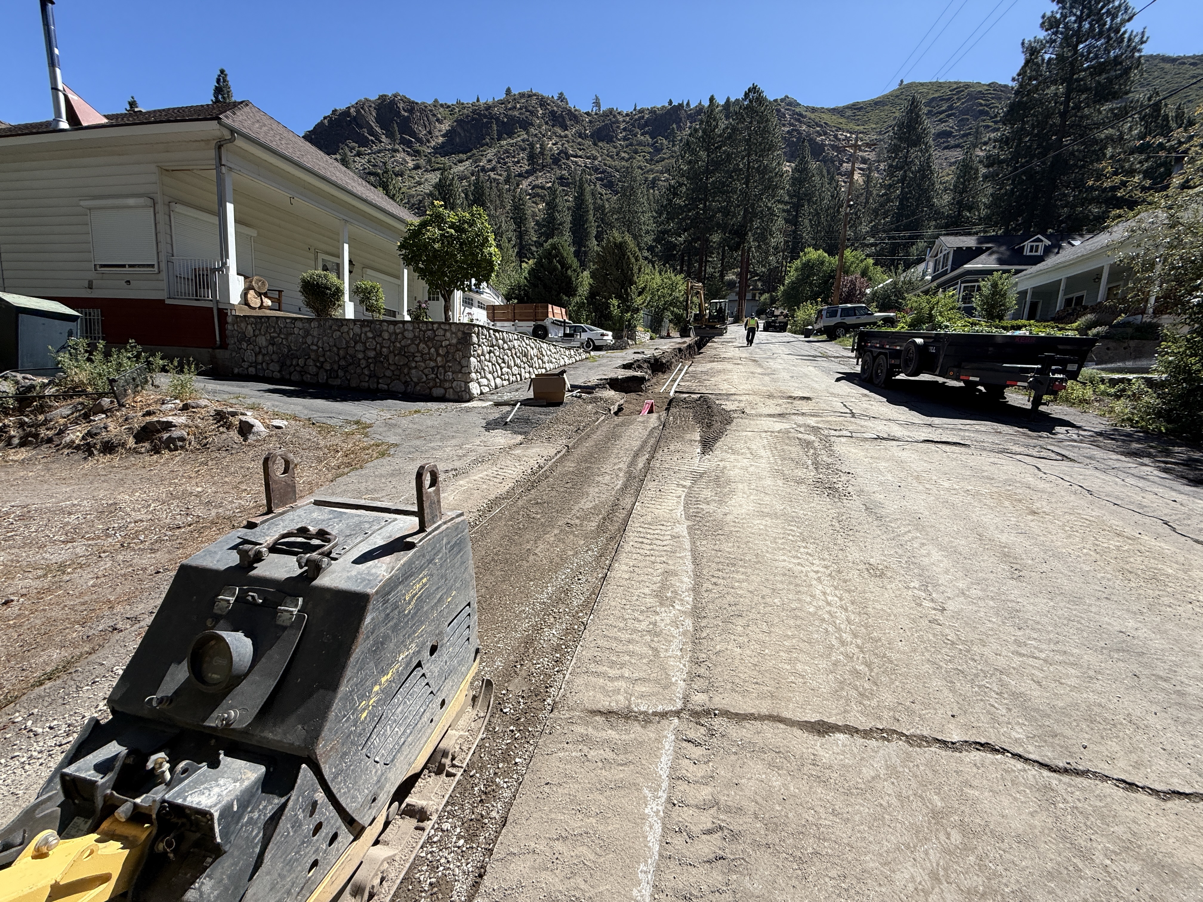 The image shows an open trench along the side of a residential street with a mechanical compactor in the foreground. There are signs of earthwork and a long trench leading up the street. A construction worker and a piece of excavating equipment are visible further down the road. Landscaping and residential properties line the street, suggesting limited space for maneuvering.