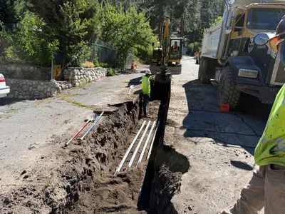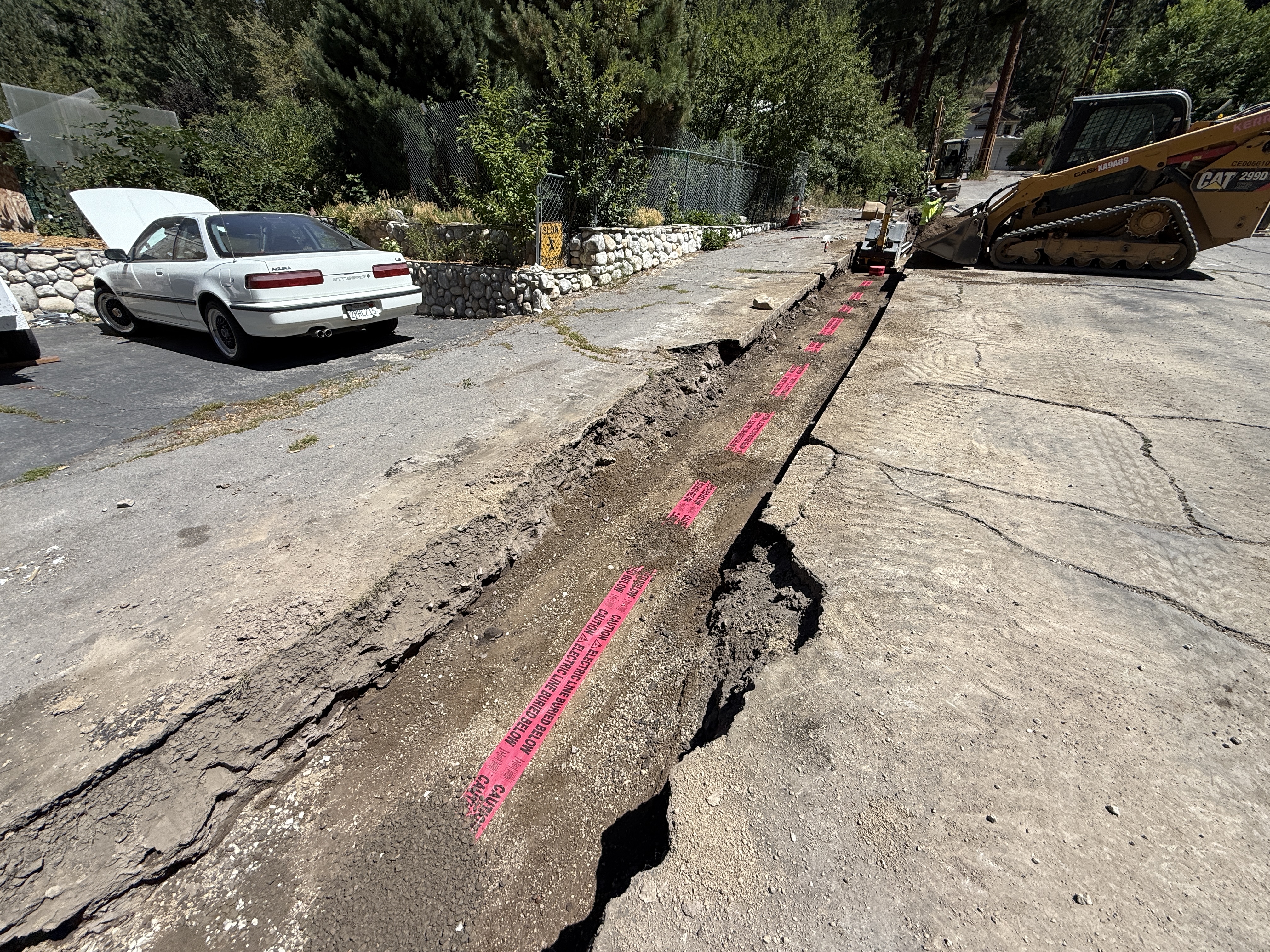 paved surface with open trench clear and sunny conditions accessible but slightly congested due to equipment positioning
