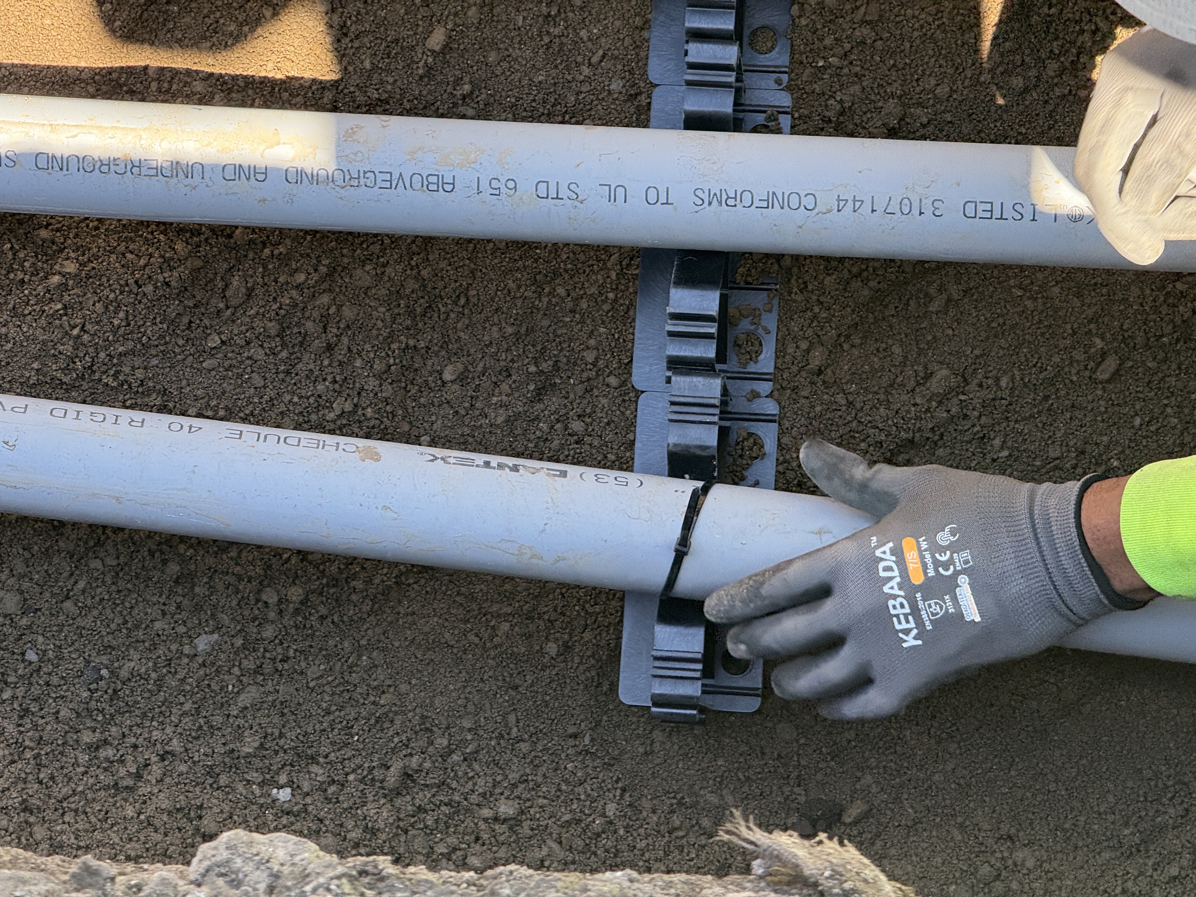 The image shows an installation of PVC conduits in an excavated trench. The conduits are being aligned and secured using a spacer bracket. A worker is wearing gloves while adjusting the conduits. The soil around the install appears compact, indicating preparation for conduit placement. This step is part of a wider duct bank installation effort.