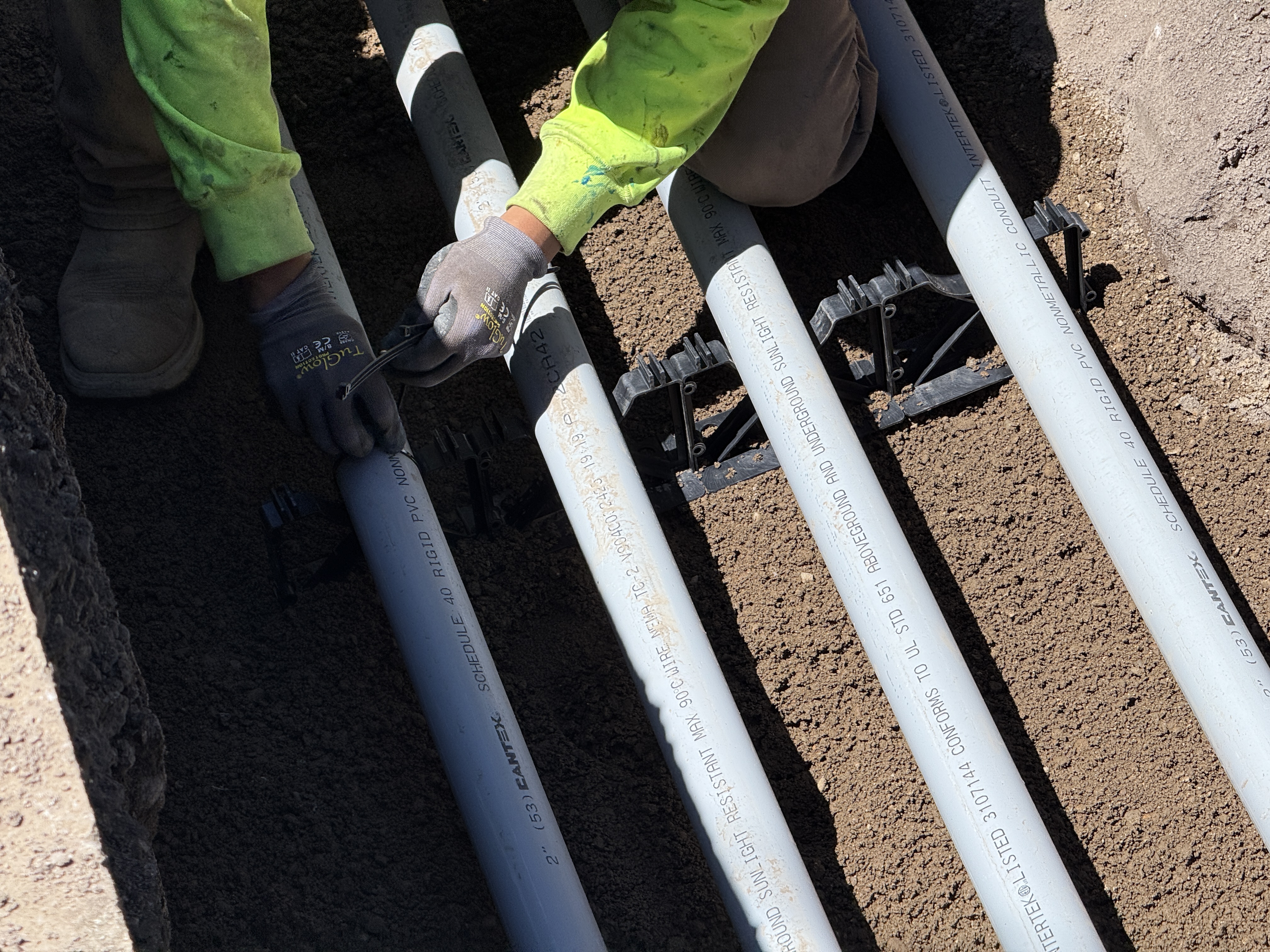 The image shows a person working in a trench with several PVC conduit pipes being assembled. The worker is using a tool to attach conduit racks that support the pipes. The pipes are laid parallel to each other, and the surrounding area consists of compact soil. The worker is wearing a high-visibility shirt and work gloves.