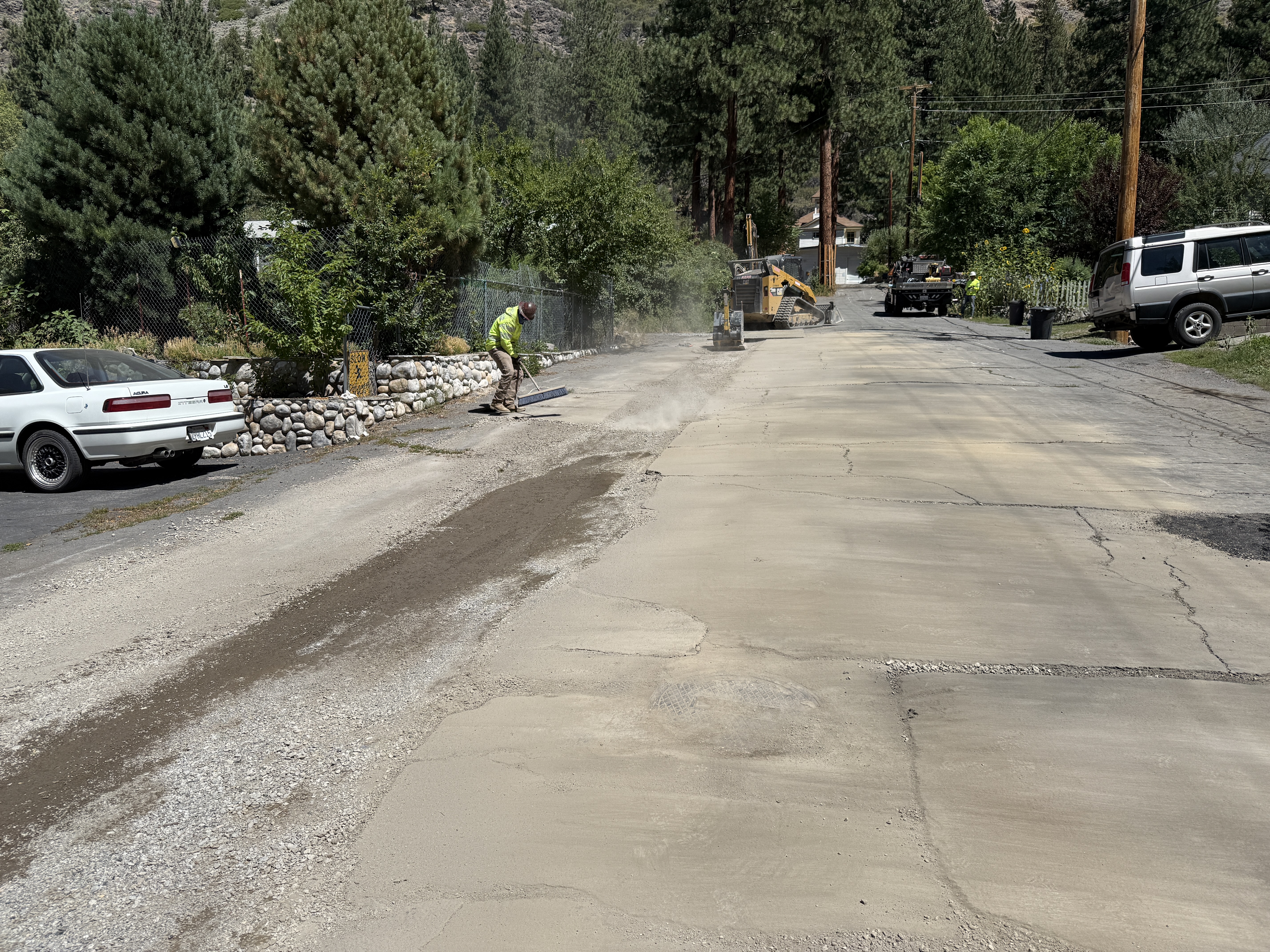 The image shows a worker in a hi-vis vest and hard hat who is engaged in road surface grading. A small road grader or milling machine is operating on the street. Several vehicles are parked on the side. The road surface shows signs of grading with loose material. Trees and a stone wall are present along the road.