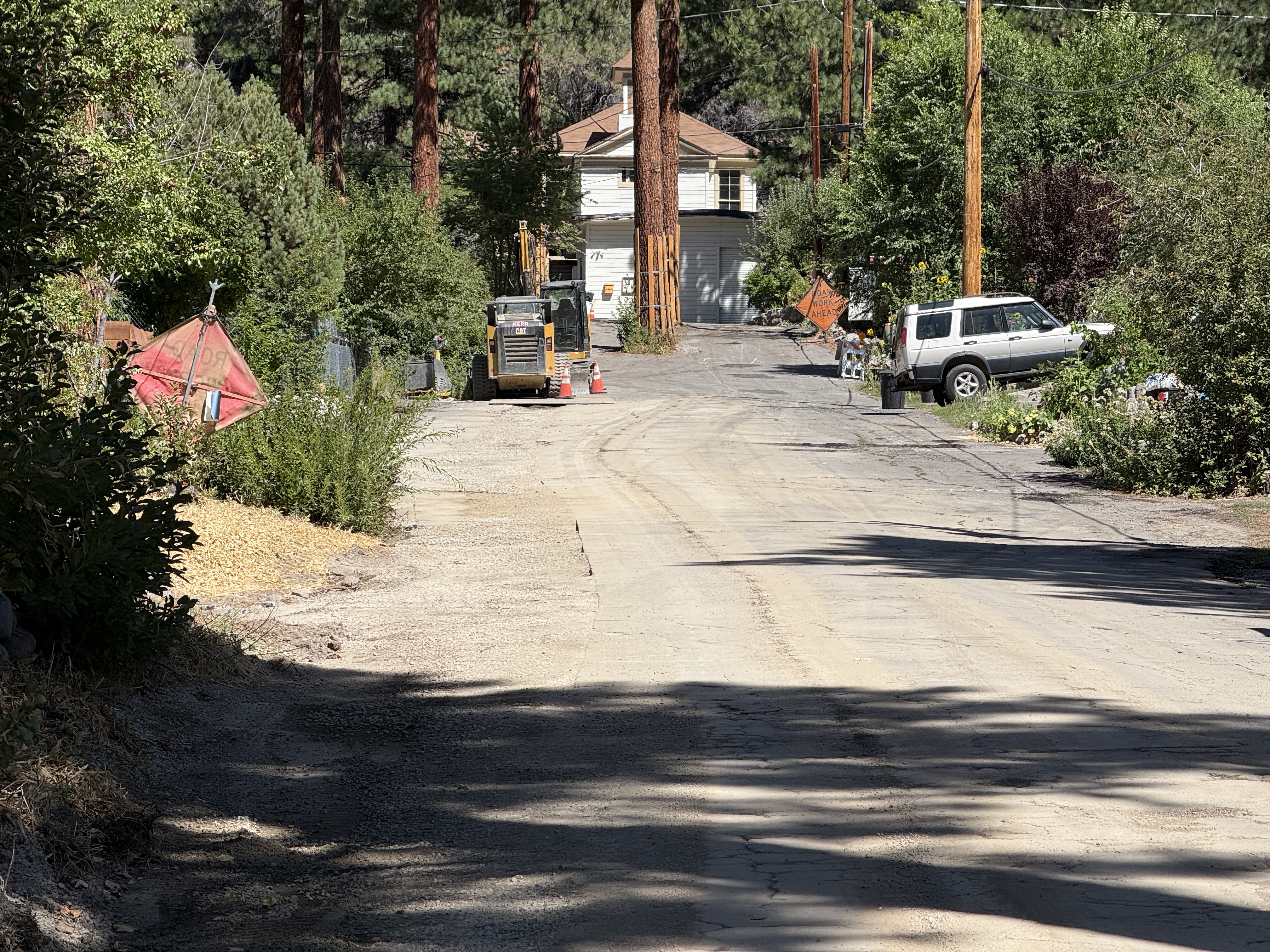 The image shows a residential street under construction with an excavator positioned centrally. Warning signs and cones indicate roadwork, and a white SUV is parked nearby. Overhead power lines and a variety of vegetation line the street. The road surface appears to be made of a rough, possibly gravel material.