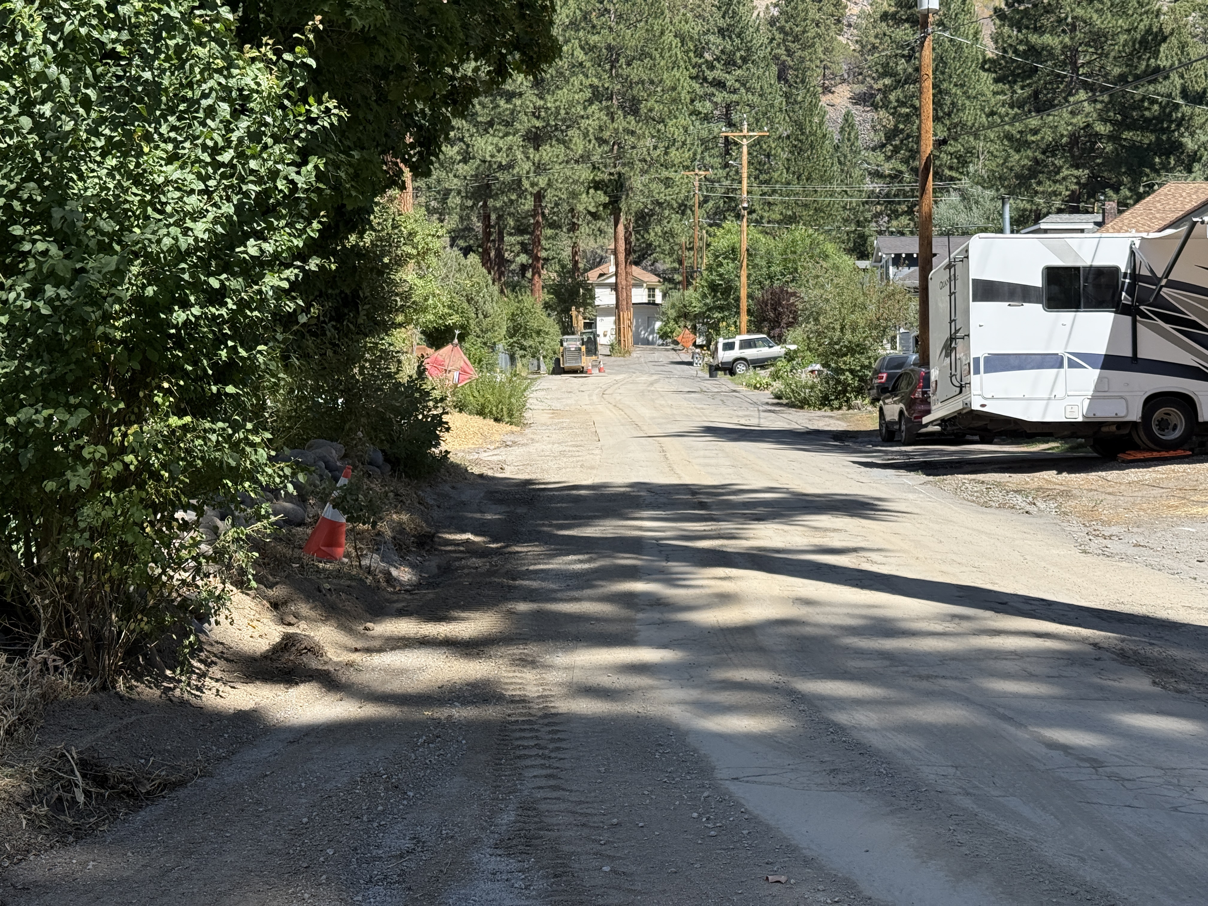 The image shows a dirt road lined with trees and a large parked RV on the right. Traffic safety cones are placed along the edge of the road. The scene suggests a residential or semi-rural area, with no active construction activities or heavy machinery visible.