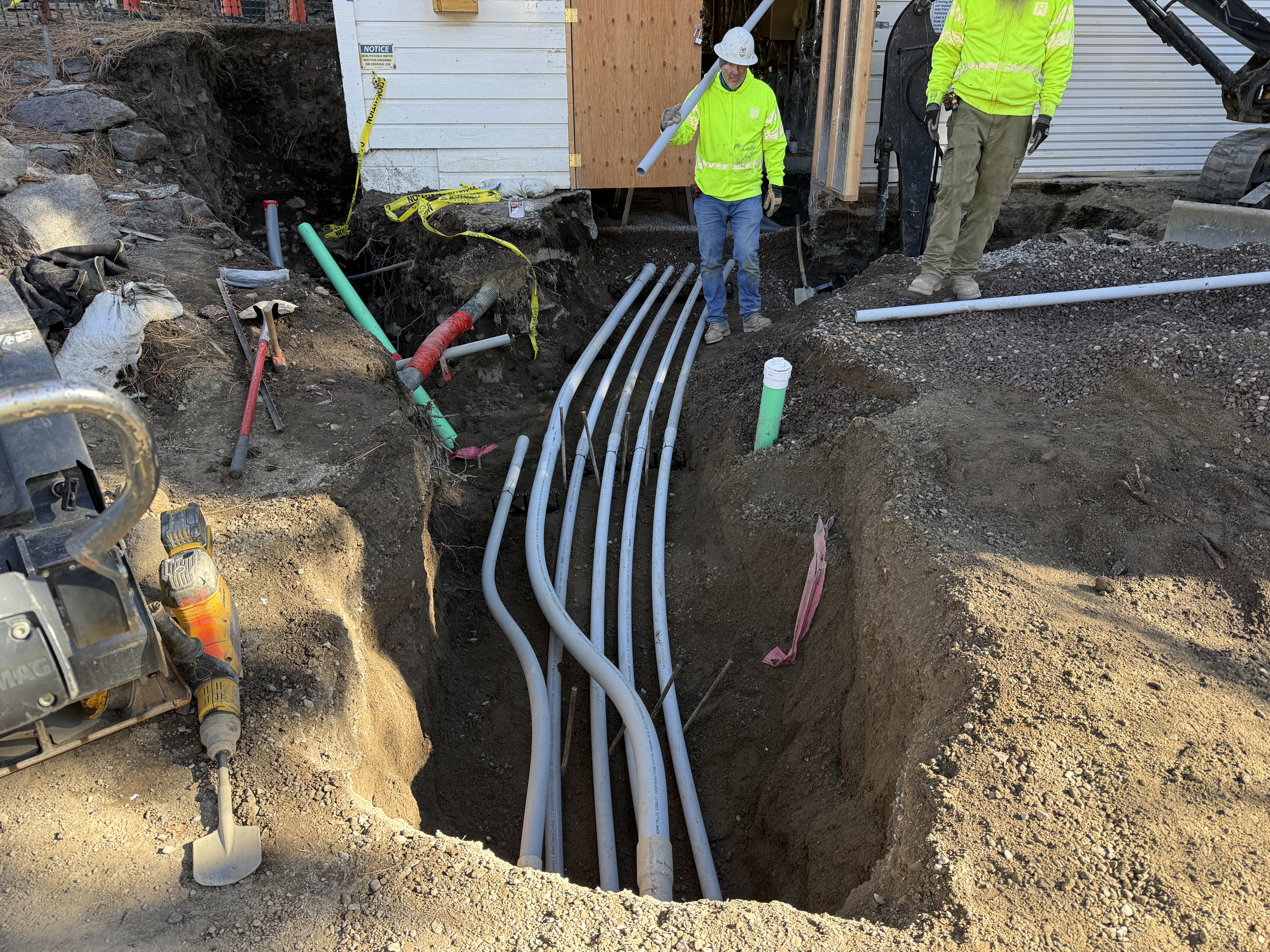 The image shows a trench with multiple parallel conduit pipes being installed as part of a duct bank project near a water tank. Two workers are present, both wearing PPE including hard hats and hi-vis vests. A small excavator is positioned near the trench, and tools are scattered on the ground nearby. Bright weather conditions suggest clear visibility.