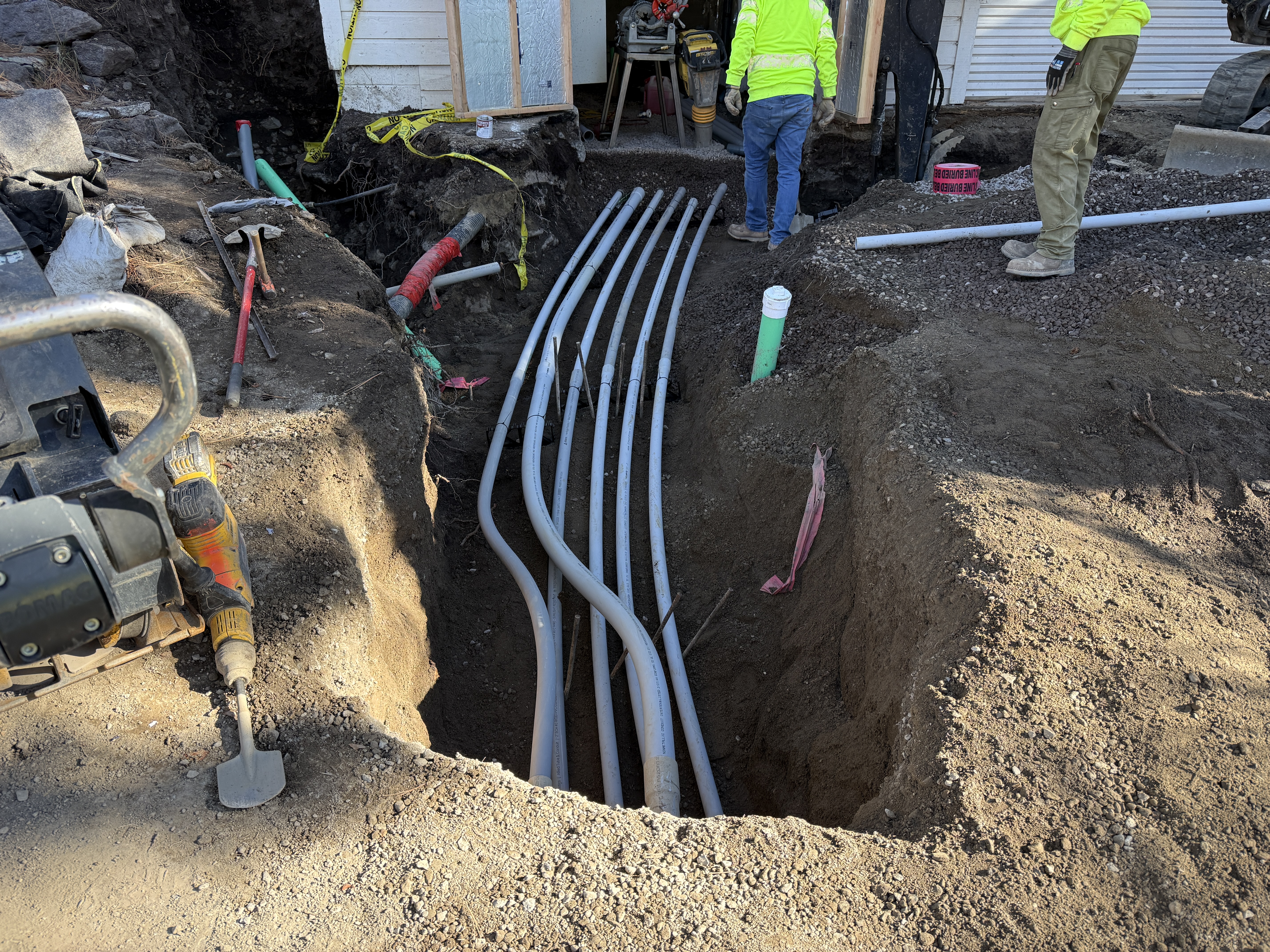exposed soil with open trench clear daylight conditions congested with multiple conduits and tools