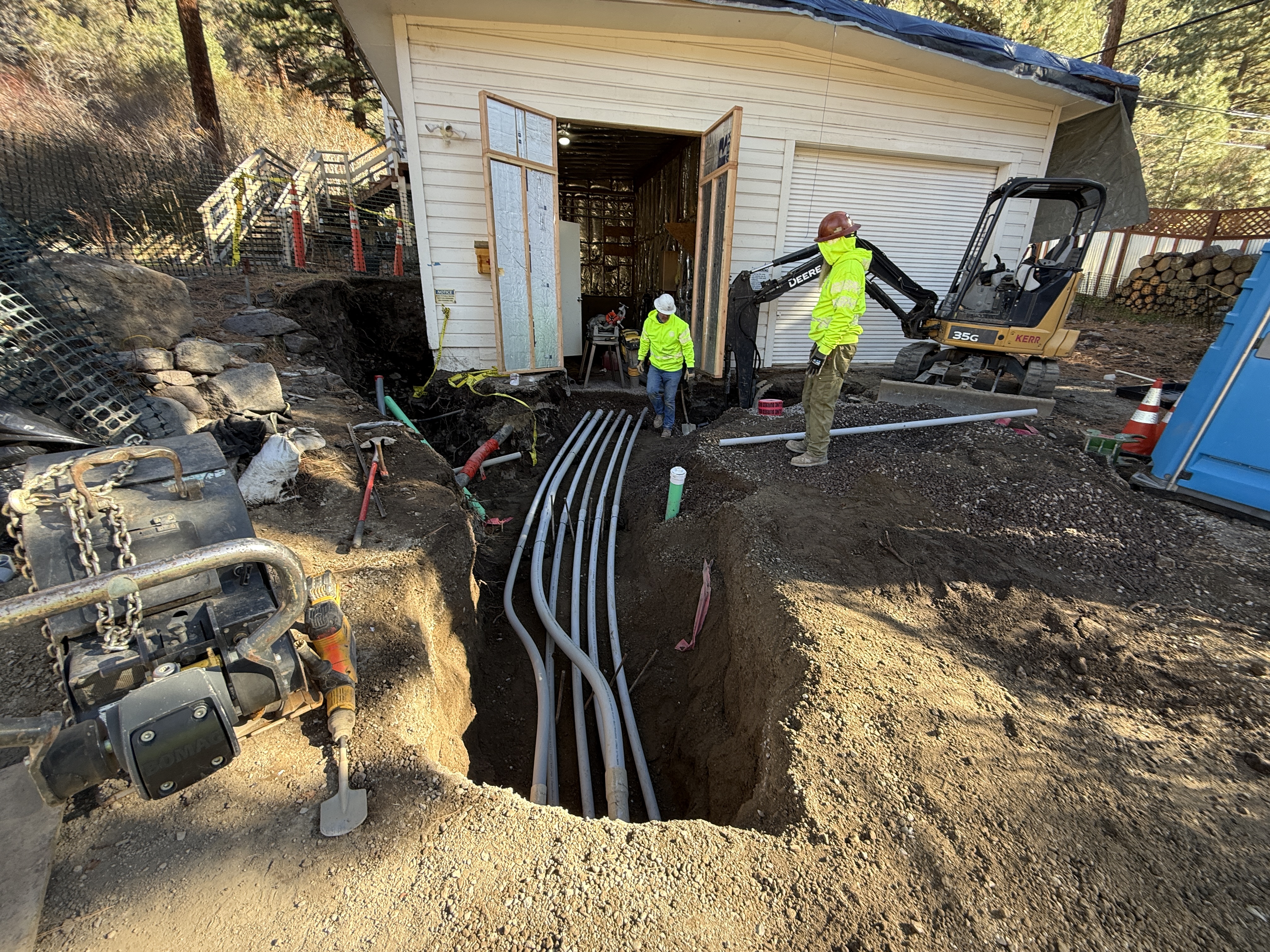 The image shows a trench with multiple PVC conduits extending into a building. Two workers are present, wearing safety gear, and an excavator is operating nearby. The setting suggests underground utility work. Tools and equipment are staged along the trench edges.