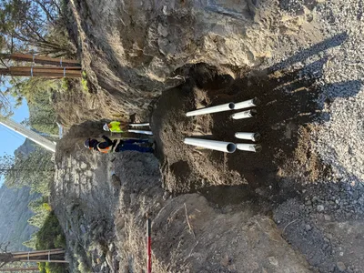 soil with gravel and open trench clear daylight conditions equipment positioned along access path beside trench