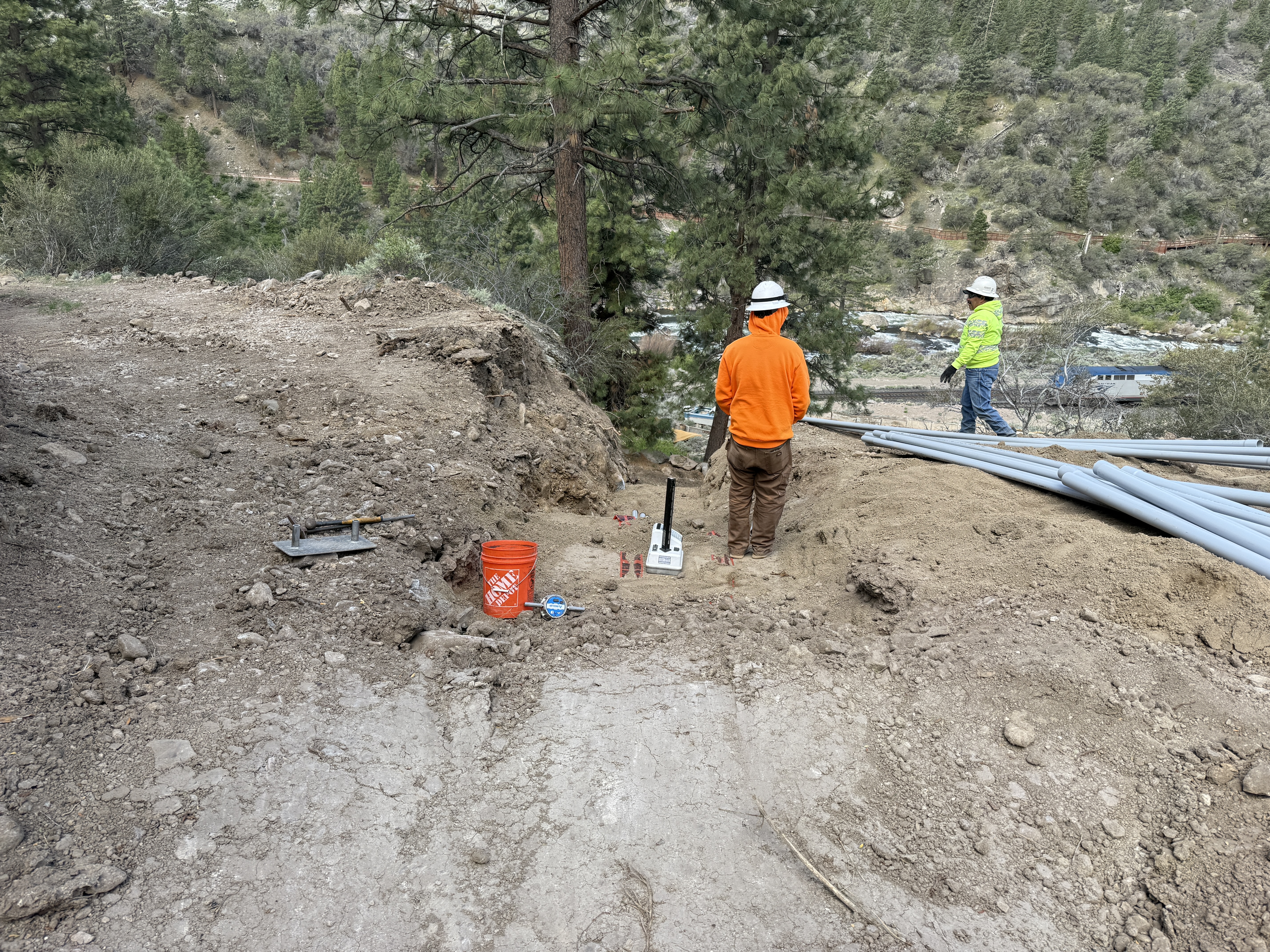 The image shows a construction site with two workers in PPE near a duct bank under construction. PVC pipes are laid on the ground, and digging tools are visible nearby. The site appears to be on uneven, excavated terrain, surrounded by trees.