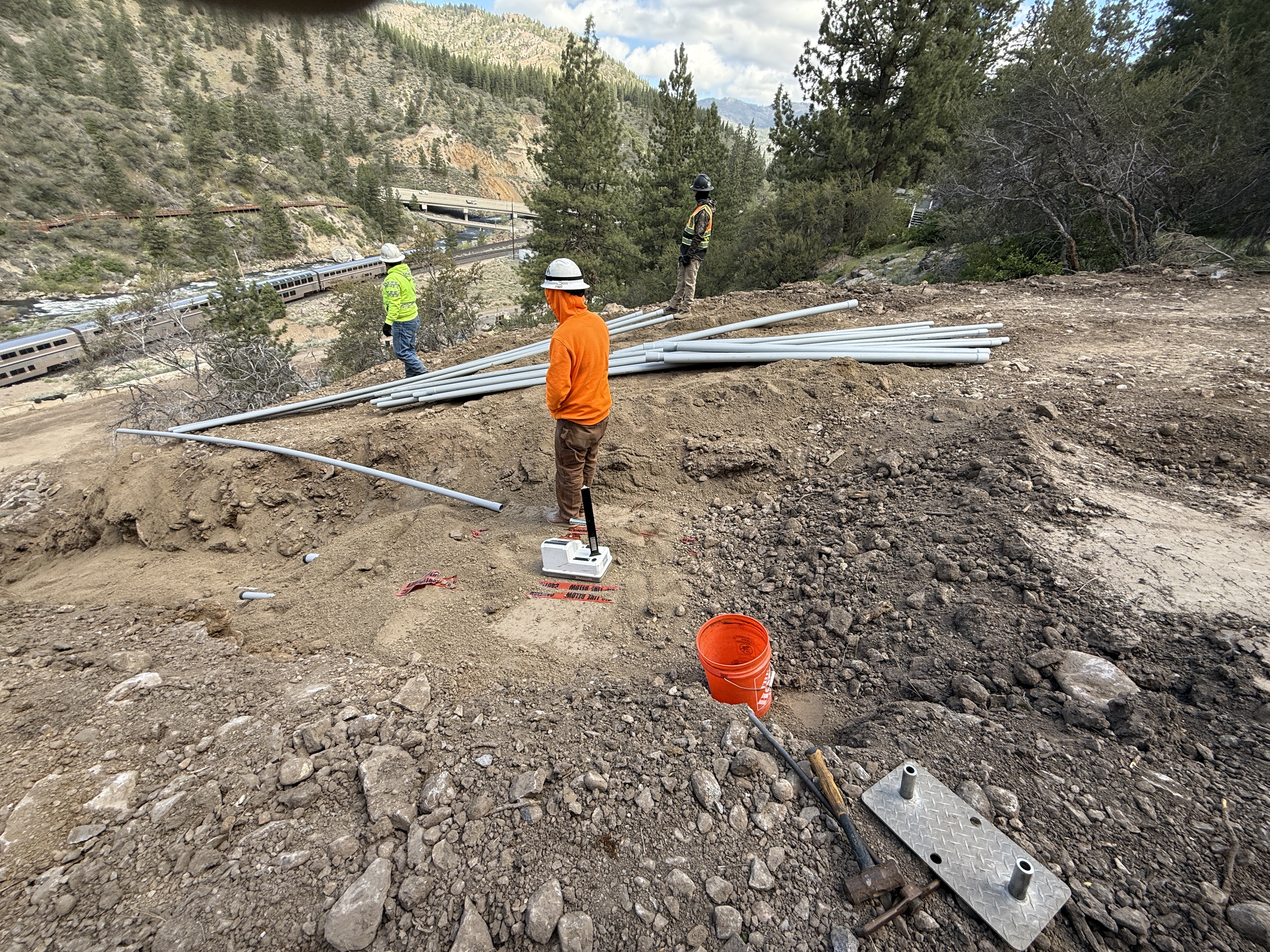 The image shows three workers in PPE on a hillside area. They are near a bundle of metal conduit pipes laid on the ground with some scattered around. A rectangular trench or excavation area is visible, indicating ongoing preparatory work for conduit installation. Basic tools and a bucket are also visible, suggesting manual installation efforts.