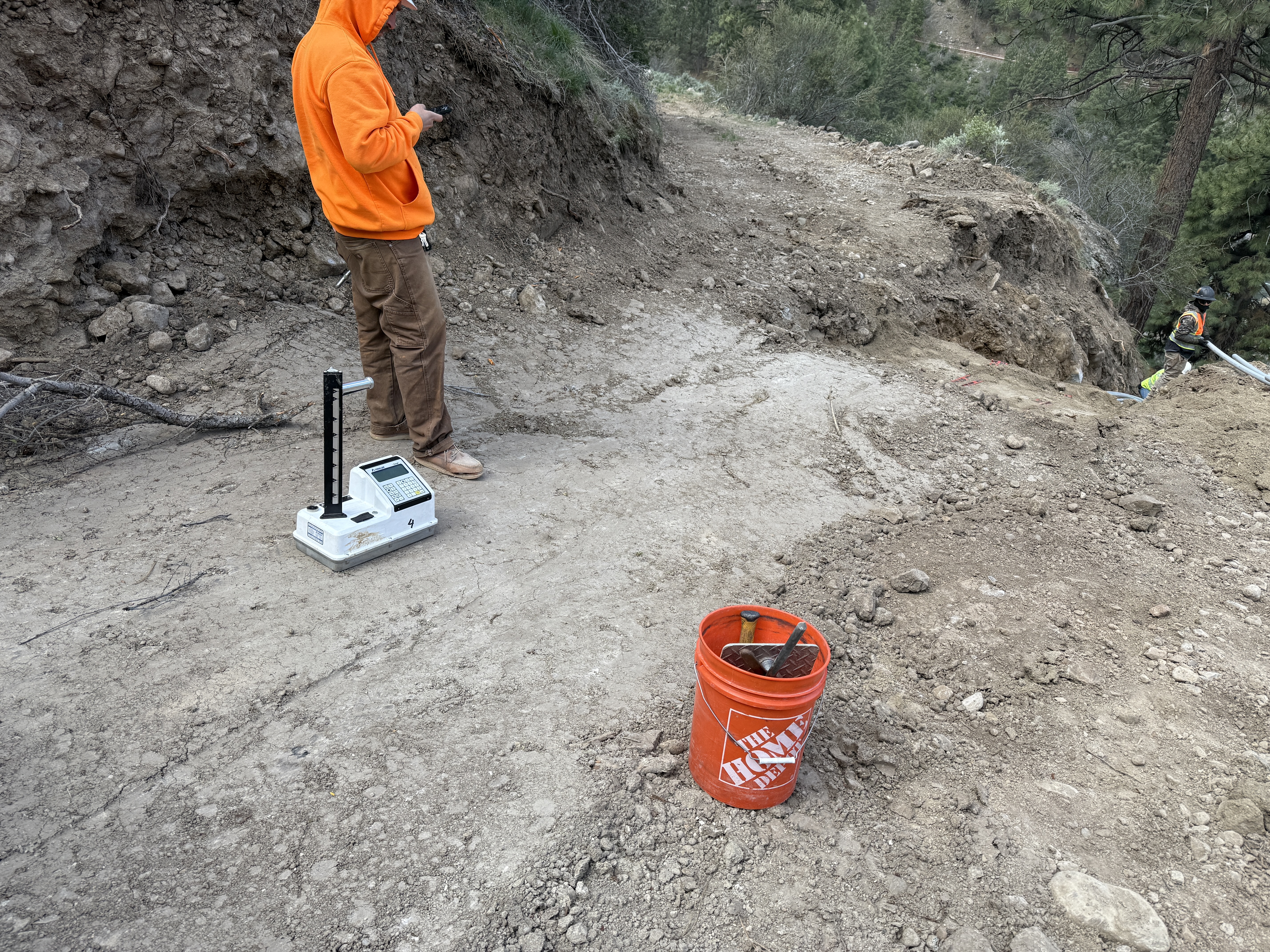 A person in orange attire is using a handheld device next to a piece of soil testing equipment placed on a dirt surface. An orange bucket with tools is nearby, and another person is in the background working on the slope. The area appears to be a cleared dirt path with uneven ground.