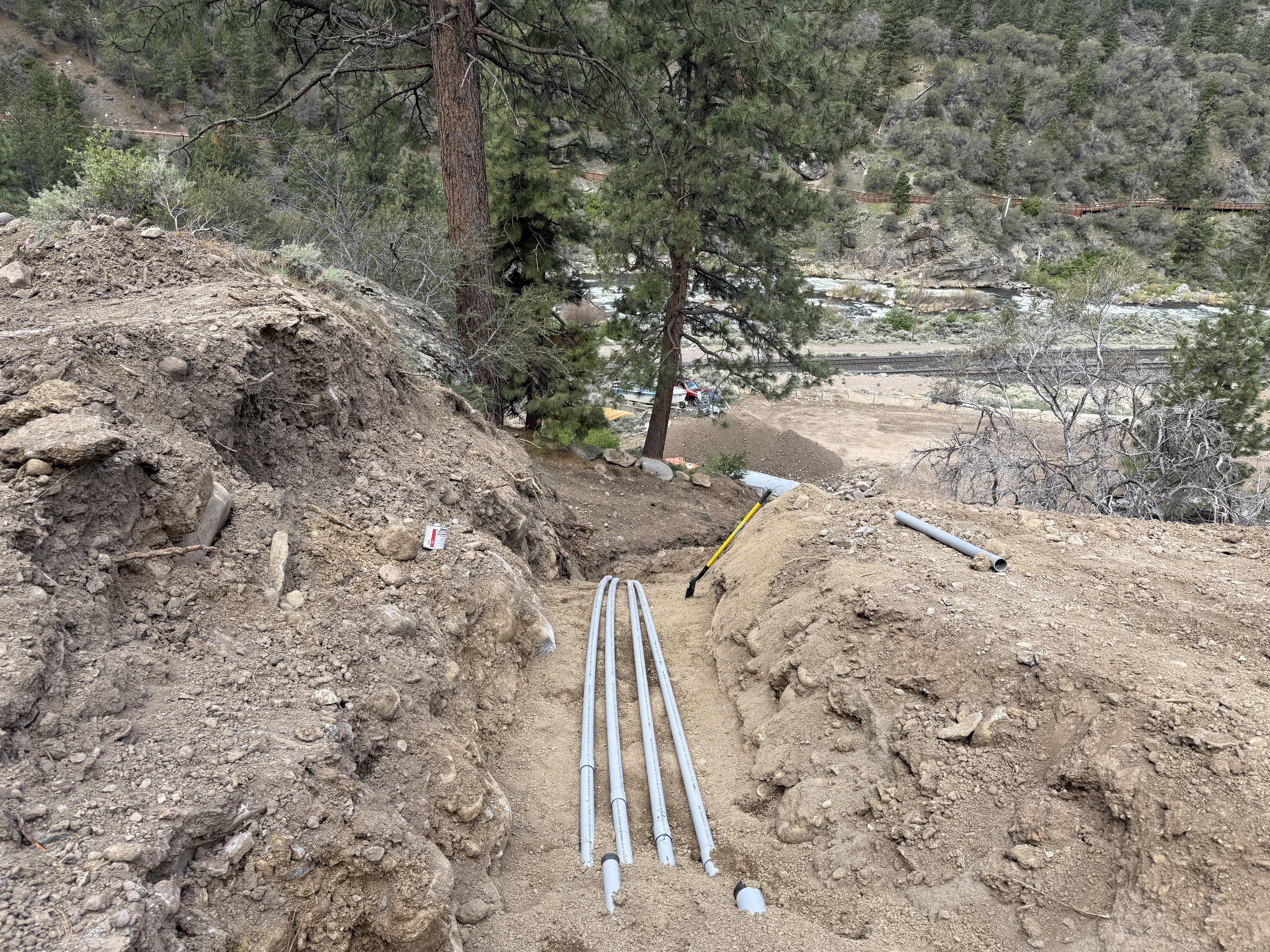 The image shows a trench dug into a hillside with multiple conduits placed parallel to each other within the trench. The trench is surrounded by loose soil, and the area appears to be part of ongoing construction work possibly for utility routing. In the background, a slope with trees and a river is visible.