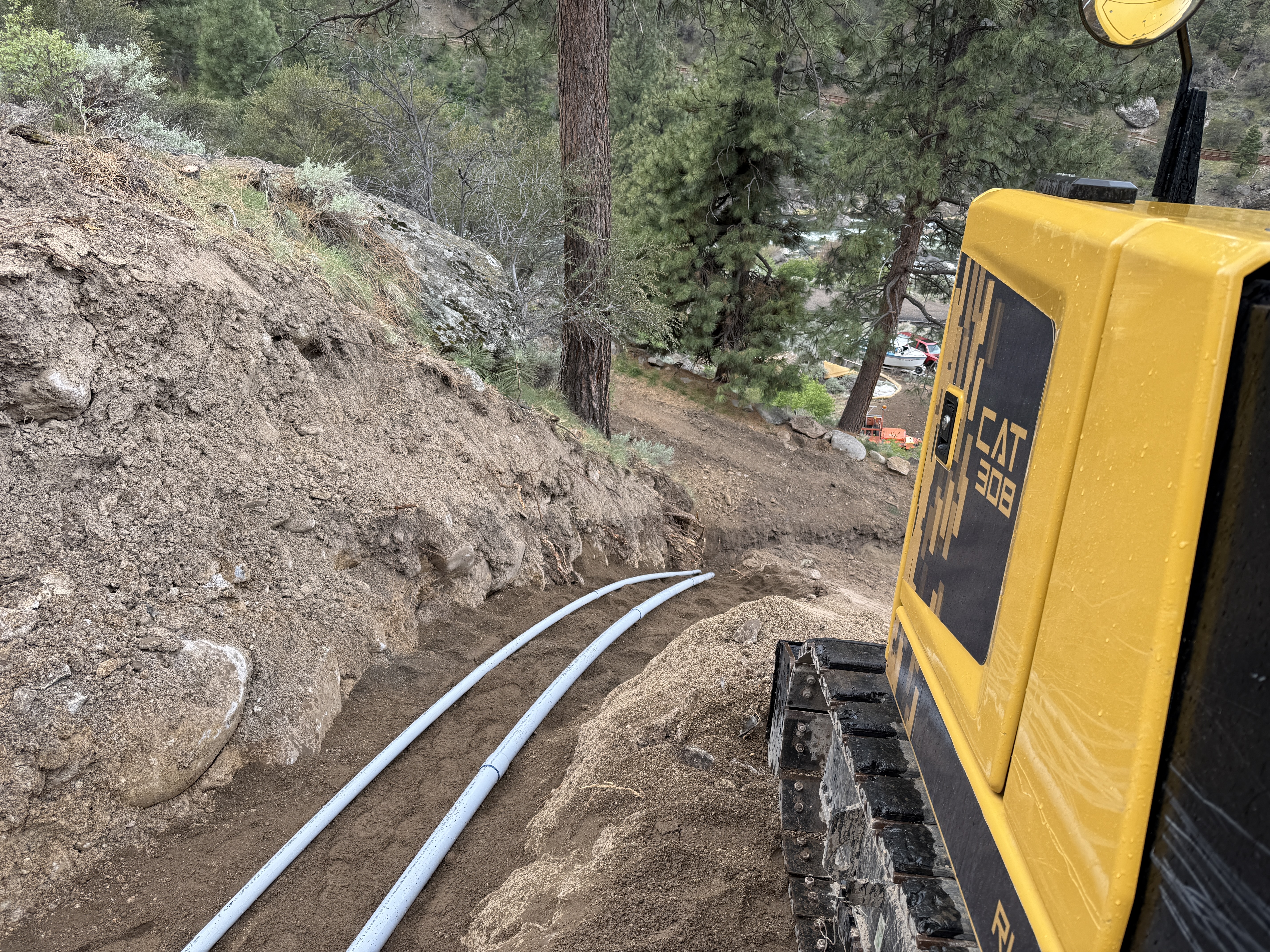 The image shows an excavator positioned on a slope next to a trench with conduit installed at the bottom. The area appears to be part of a new installation or upgrade, with visible earth displacement and conduits already in place. The machinery is positioned on the slope, indicating active trenching or excavation work. No safety barriers or PPE are visible.