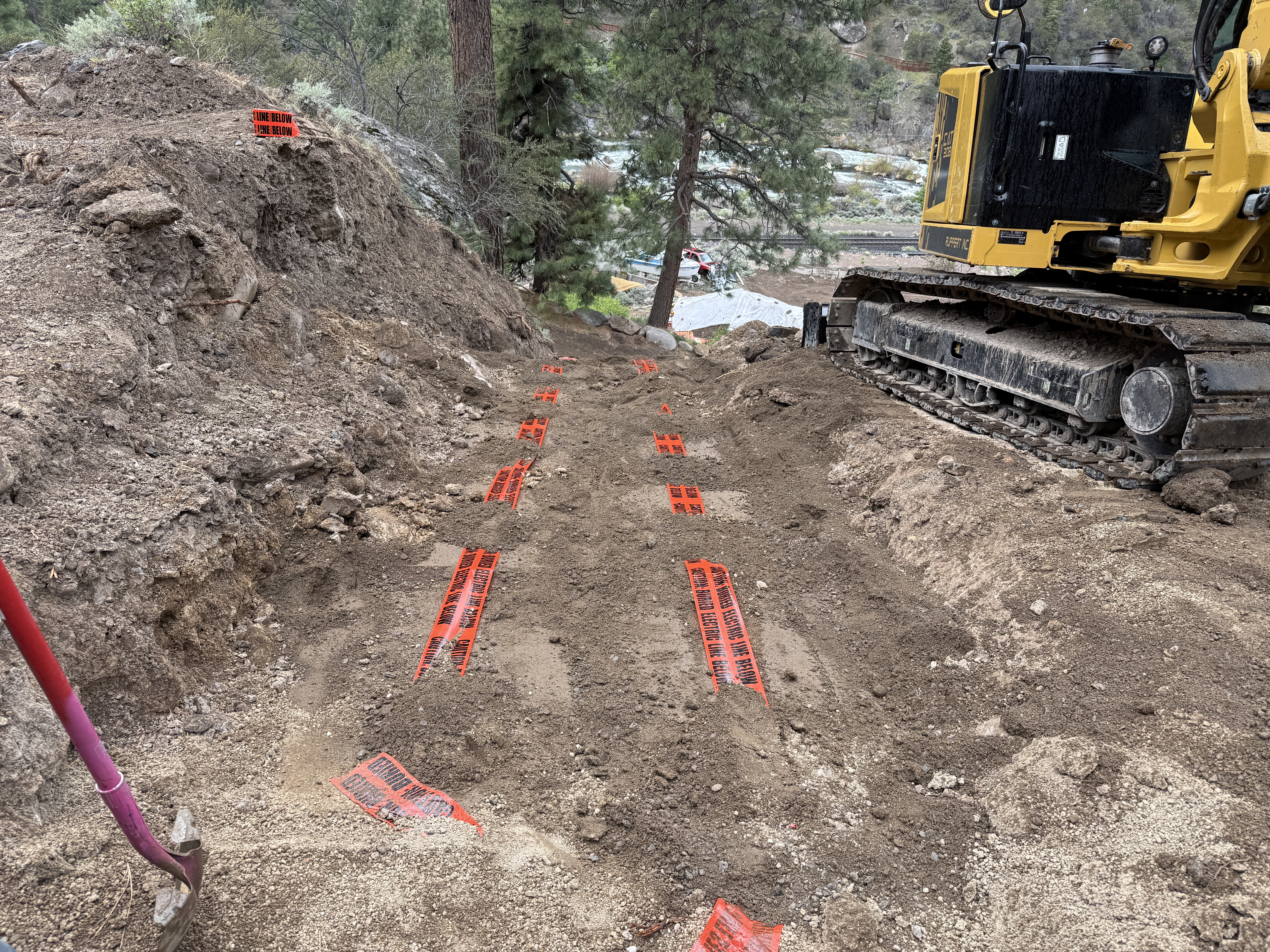 The image shows an active trenching operation with a tracked excavator positioned on the right side. Red warning tapes marked 'BURIED ELECTRIC LINE BELOW' are laid along the trench path. The trench is dug into dirt and is bordered by uneven ground and nearby foliage in a wooded area.