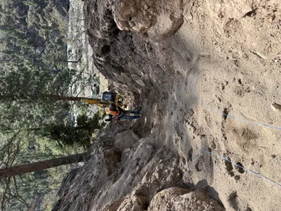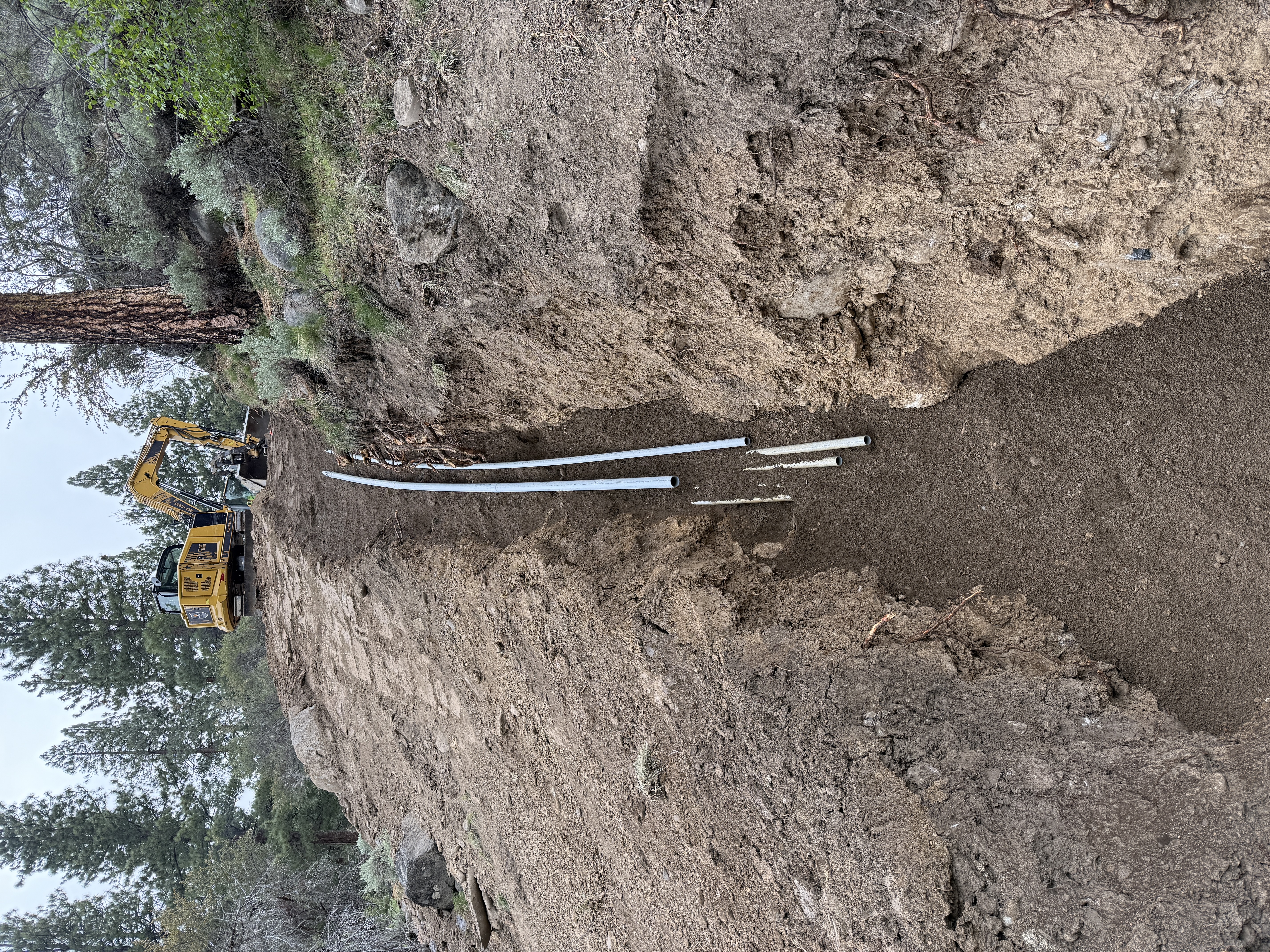 The image shows an open trench on a slope with exposed conduit pipes running through it. An excavator is positioned at the top of the slope, likely used for the trenching activity. Two conduits can be seen clearly, and the trench appears to be freshly dug. The surrounding area includes trees and vegetation typical of a hillside environment.