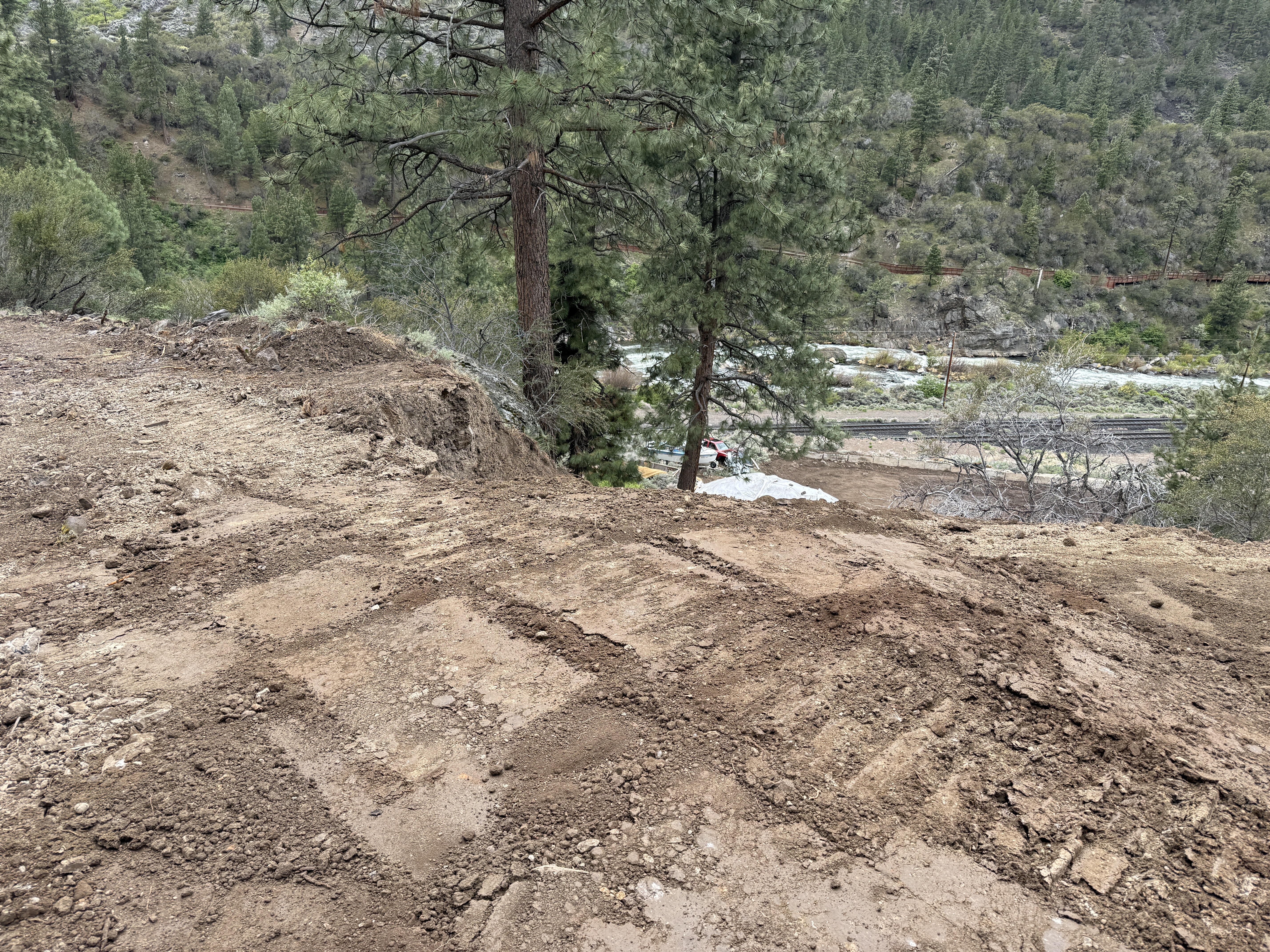 The photo captures a sloped area with visible track marks in the soil, indicating recent movement of heavy equipment. Trees and bushes are present at the edge of the slope with a possible construction work area visible in the background. The earth surface is uneven with no active machinery or construction personnel in sight. There are no visible safety features such as barriers or cones.