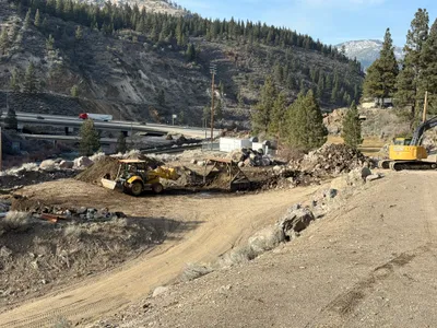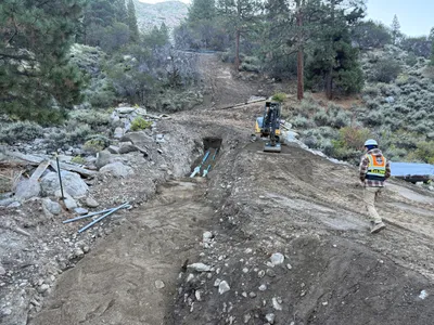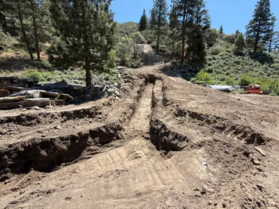 This image captures a trench being dug in a dirt pathway leading through a forested area. The trench extends from the foreground to midground, with freshly dug soil piled on both sides. Several large rocks are positioned near the trench, and sparse vegetation is visible around the area.