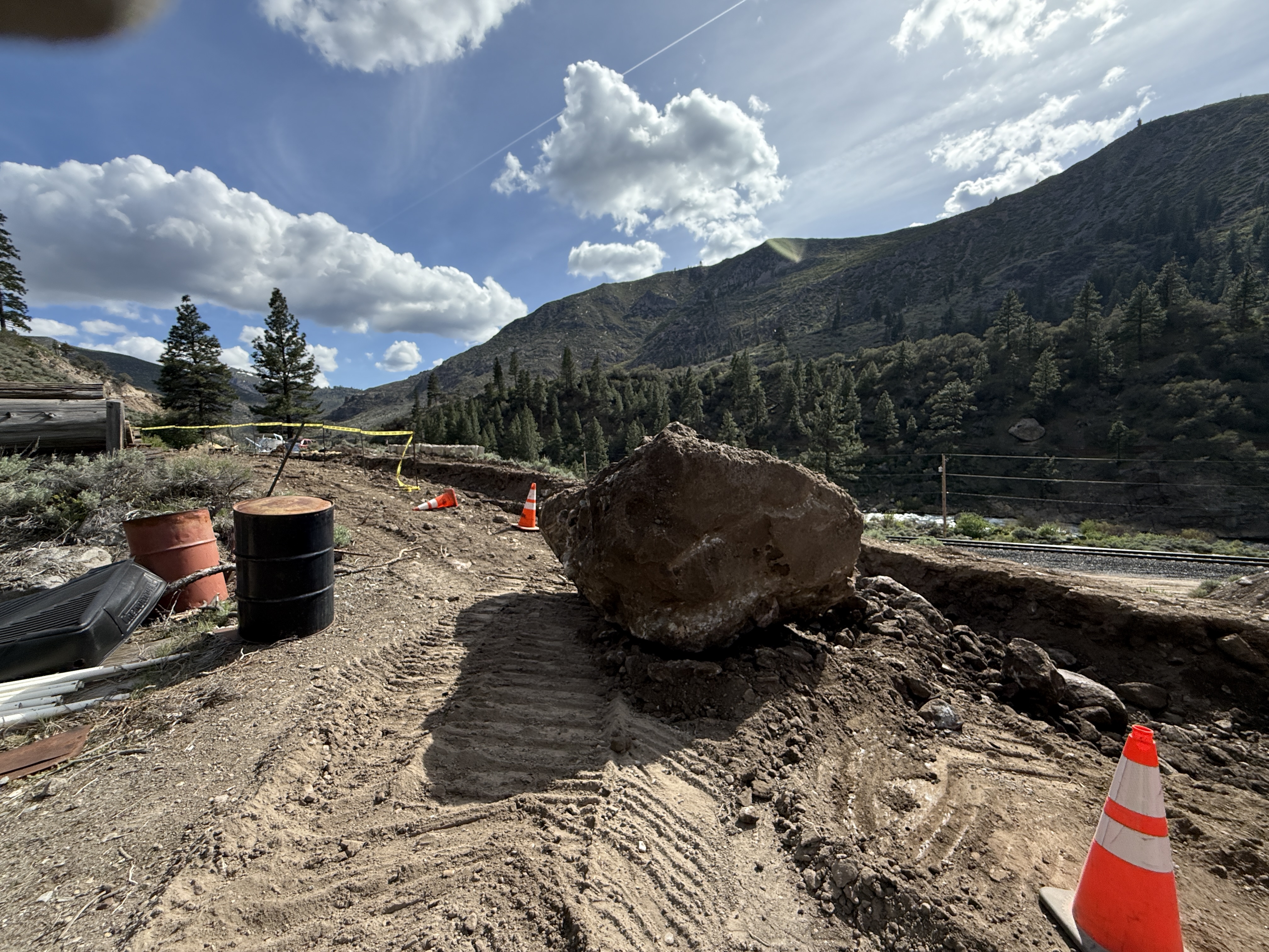 The image shows a large boulder positioned prominently at a site that appears to be undergoing excavation. Soil is visibly disturbed with track marks, suggesting equipment operation. Traffic cones and barrels are placed near the boulder, and yellow caution tape is visible in the background. There is no heavy equipment or vehicles in the immediate frame.