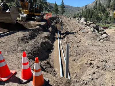 The image shows a construction site with two pieces of heavy machinery actively engaged in moving soil and rocks. A large pile of rocks and soil is prominent in the foreground, with an excavator and a bulldozer visible behind the piles. The site is surrounded by grassy and rocky terrain, with hills and trees in the background. The activity appears to be related to land clearing or excavation work.
