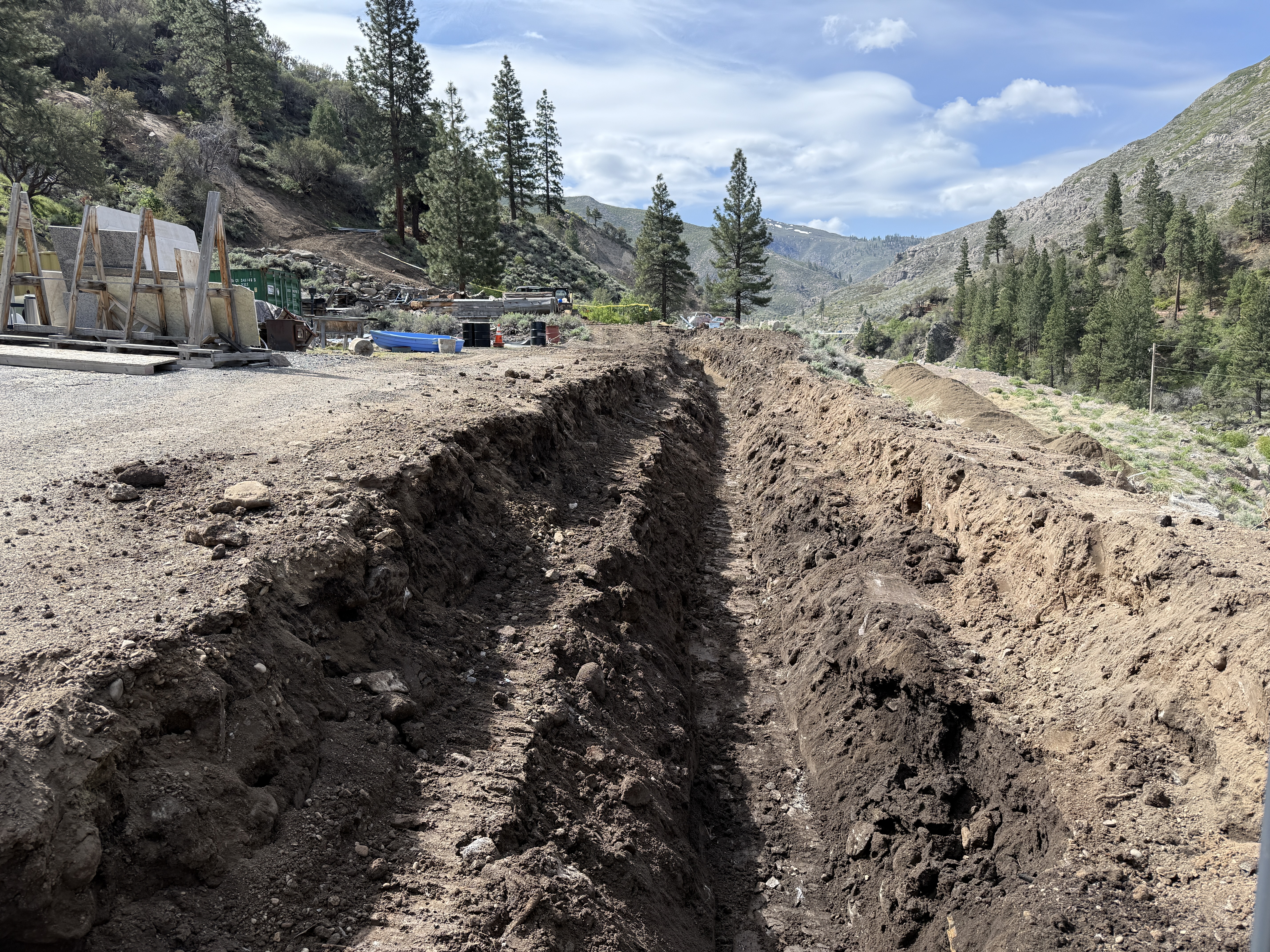 The image shows a long, open trench running through a dirt area adjacent to a partially paved space with various construction materials. In the background, there are trees on hilly terrain with equipment and materials staged nearby. No active machinery or personnel are seen working in the trench. The scene is under partly cloudy skies and is well-lit with natural daylight.