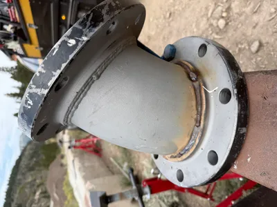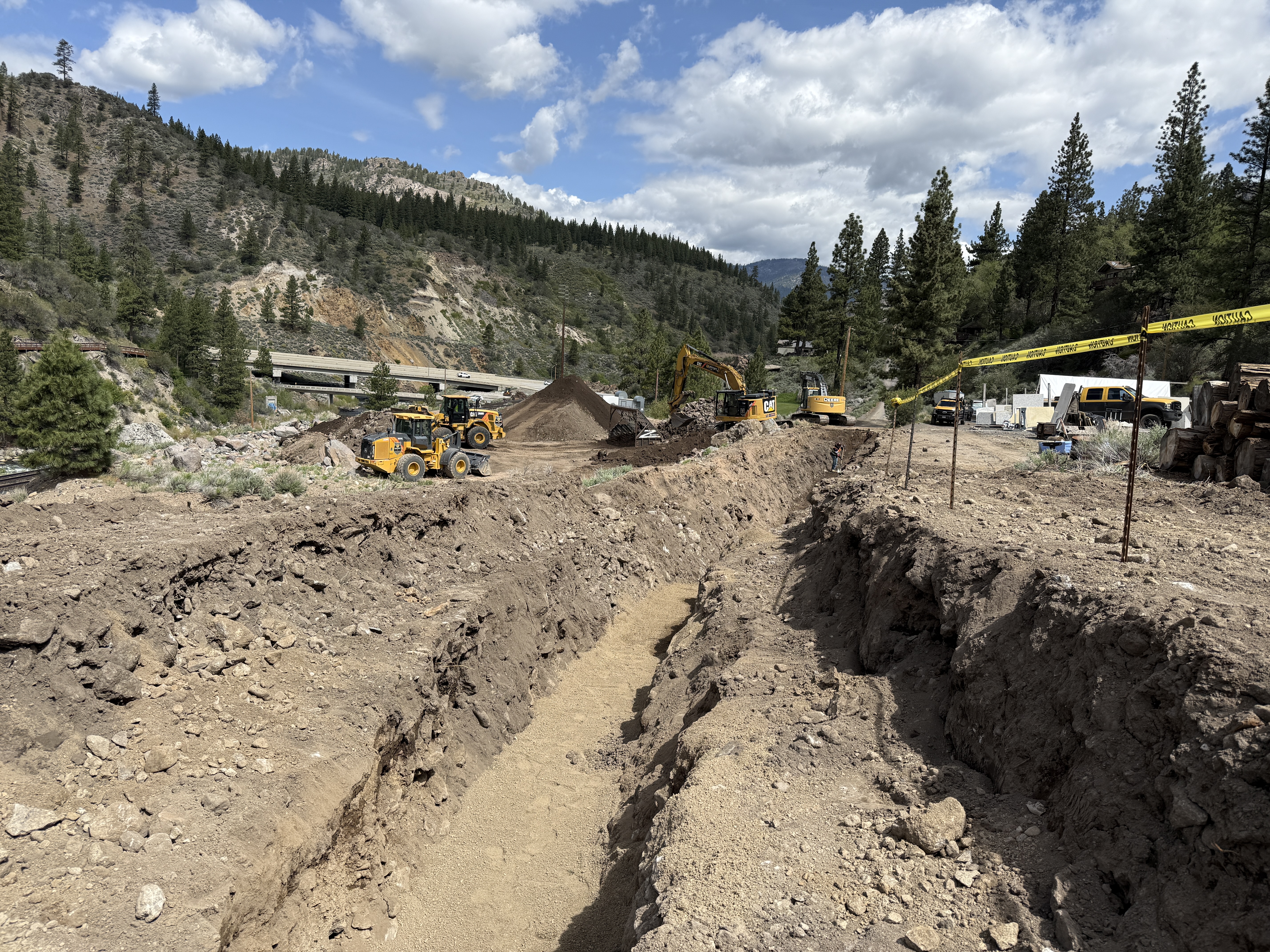 The image shows an active trenching operation with a visible trench in the foreground. Several excavators and loaders are operating in the area, moving soil and operating within the trench zone. A caution tape is stretched across part of the site, suggesting controlled access. The background shows a forested hillside and a nearby highway bridge.