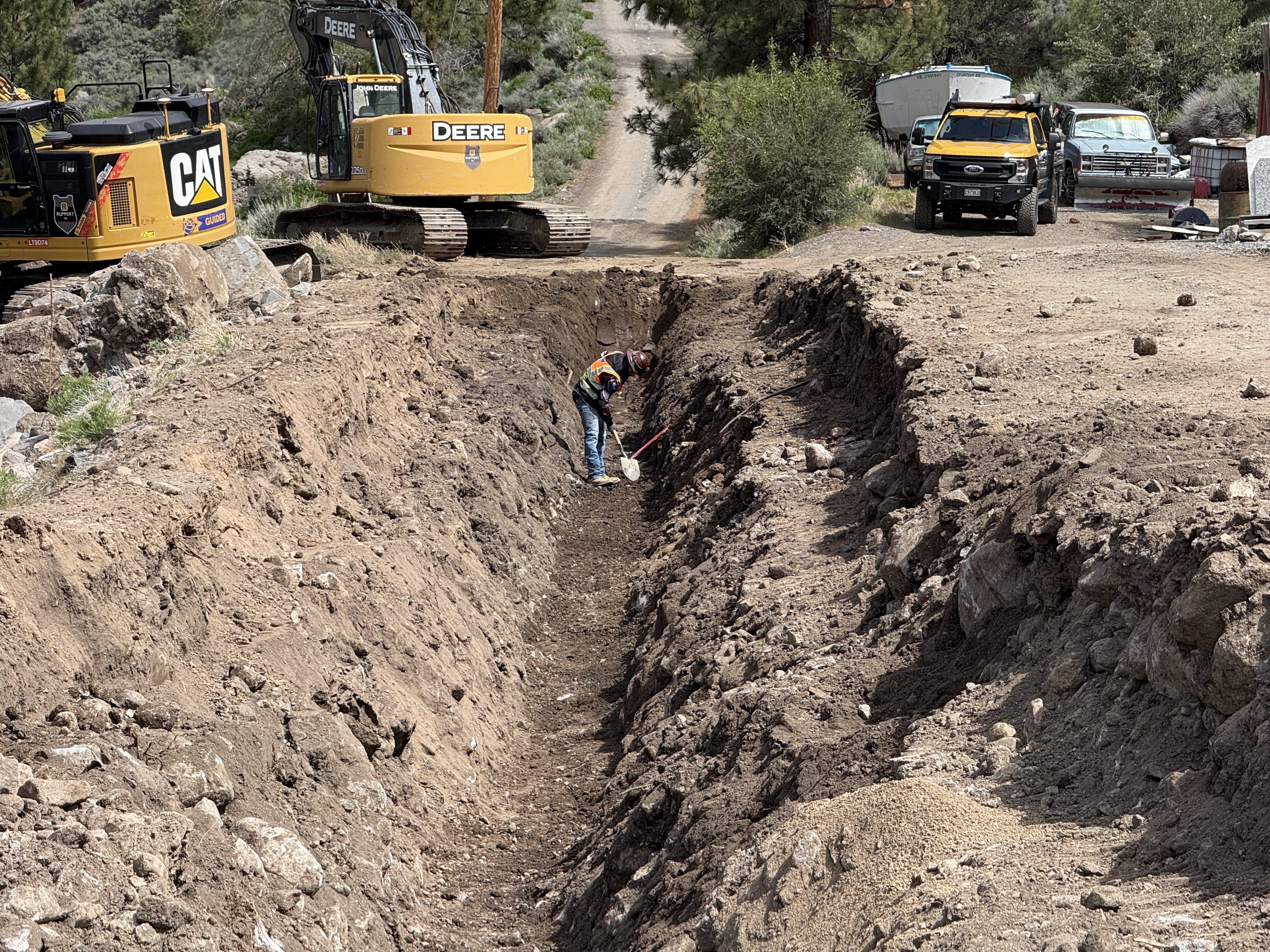 The image shows a deep trench with a worker inside using a hand tool, likely for fine excavation or cleanup. Two excavators are parked nearby, one with visible branding. A pickup truck is parked adjacent to the trench. The area is in a natural landscape with trees visible in the background, suggesting cleared access for the operation.