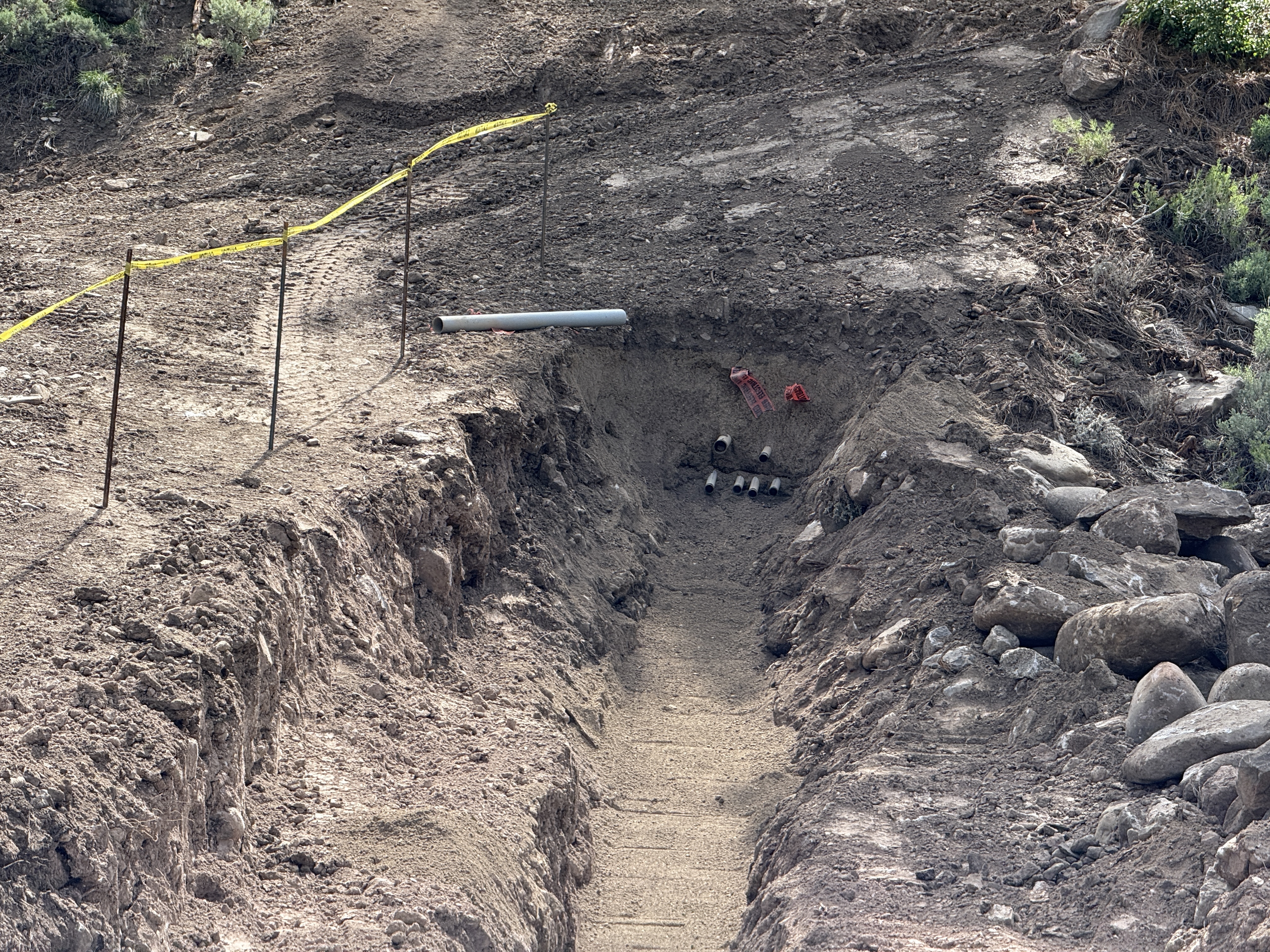 The image shows a trenching activity in a dirt area, with several pipes placed at the end of the trench. Caution tape runs along the side of the trench, which appears to be dug into the ground. Rocks are visible on one side, and the soil is uneven around the trench. The work seems to be part of a duct bank or utility service installation.